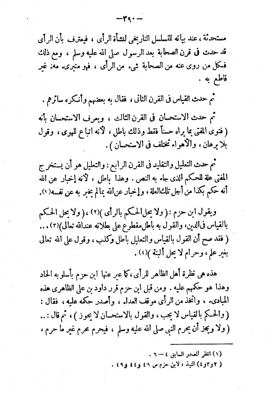 ويقول ابن حزم: «وَلَا يَحِلُّ الحُكْمُ بِالرَّأْيِ» (٢)، «وَلَا يَحِلُّ الحُكْمُ بِالقِيَاسِ فِي الدِّينِ، وَالقَوْلُ بِهِ بَاطِلٌ مَقْطُوعٌ عَلَى بُطْلاَنِهِ عِنْدَ اللهِ تَعَالَى» (٣) «فَقَدْ صَحَّ أَنَّ القَوْلَ بِالقِيَاسِ وَالتَّعْلِيلِ بَاطِلٌ وَكَذِبٌ، وَقَوْلٌ عَلَى اللهِ تَعَالَى بِغَيْرِ عِلْمٍ، وَحَرَامٌ لَا يَحِلُّ البَتَّةَ» (٤).