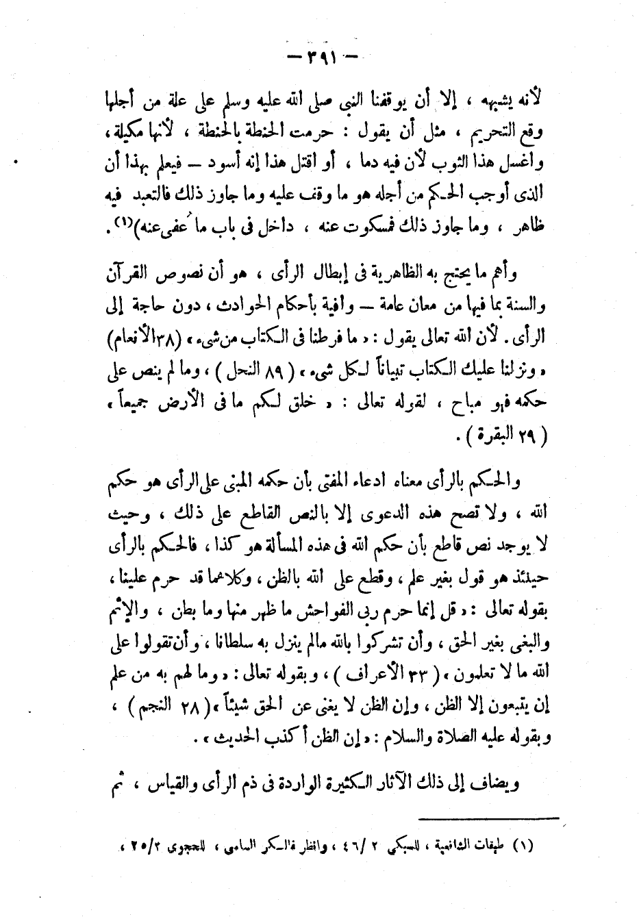 وأهم ما يحتج به الظاهرية في إبطال الرأي، هو أن نصوص القرآن والسنة بما فيها من معان عامة - وافية بأحكام الحوادث، دون حاجة إلى الرأي. لأن الله تعالى يقول: {مَا فَرَّطْنَا فِي الْكِتَابِ مِنْ شَيْءٍ} [الأنعام: ٣٨]، {وَنَزَّلْنَا عَلَيْكَ الْكِتَابَ تِبْيَانًا لِكُلِّ شَيْءٍ} [النحل: ٨٩]، وما لم ينص على حكمه فهو مباح، لقوله تعالى: {خَلَقَ لَكُمْ مَا فِي الأَرْضِ جَمِيعًا} [البقرة: ٢٩].