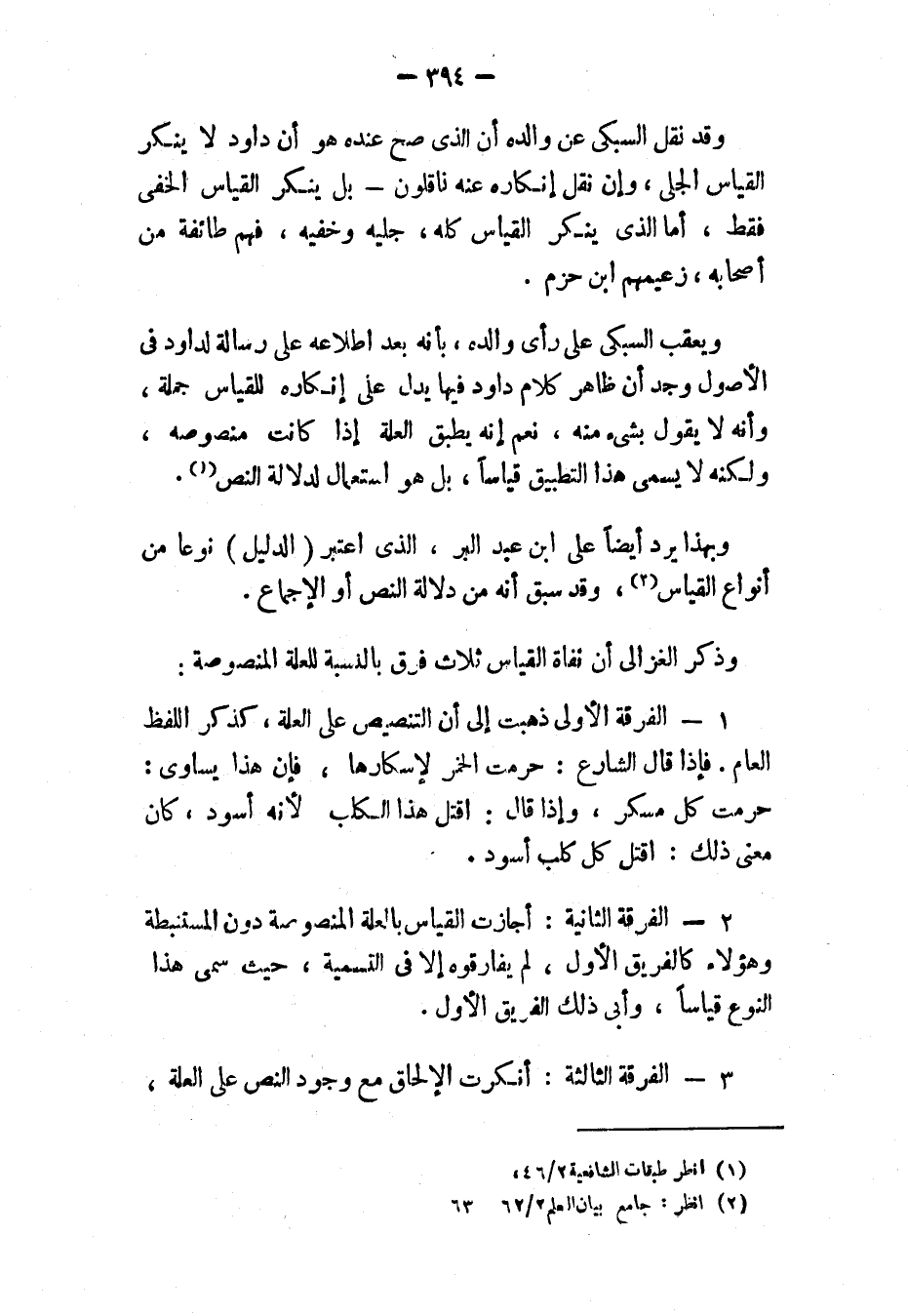 ويعقب السبكي على رأي والده، بأنه بعد اطلاعه على " رسالة " لداود في الأصول وجد أن ظاهر كلام داود فيها يدل على إنكاره للقياس جملة، وأنه لا يقول بشيء منه، نعم إنه يطبق العلة إذا كانت منصوصة، ولكنه لا يسمي هذا التطبيق قياسًا، بل هو استعمال لدلالة النص (١).