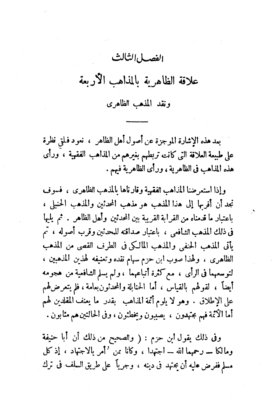 الفَصْلُ الثَّالِثُ: عَلاَقَةُ الظَّاهِرِيَّةِ بِالمَذَاهِبِ الأَرْبَعَةِ، وَنَقْدِ المَذْهَبَ الظَّاهِرِيَّ: