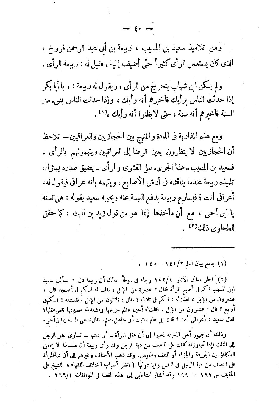 (٢) انظر " معاني الآثار ": ١/ ١٥٢ وجاء في " موطأ مالك " (*): أَنَّ رَبِيعَةَ قَالَ: سَأَلْتُ سَعِيدَ بْنَ المُسَيَّبِ: «كَمْ فِي إِصْبَعِ الْمَرْأَةِ؟»، فَقَالَ: «[عَشْرٌ] مِنَ الإِبِلِ»، فَقُلْتُ: «كَمْ فِي إِصْبَعَيْنِ؟»، قَالَ: «عِشْرُونَ مِنَ الإِبِلِ»، فَقُلْتُ: «كَمْ فِي ثَلاَثٍ؟»، فَقَالَ: «ثَلاَثُونَ مِنَ الإِبِلِ»، فَقُلْتُ: «كَمْ فِي أَرْبَعٍ؟»، قَالَ: «عِشْرُونَ مِنَ الإِبِلِ»، فَقُلْتُ: «حِينَ عَظُمَ جُرْحُهَا، وَاشْتَدَّتْ مُصِيبَتُهَا، نَقَصَ عَقْلُهَا؟»، فَقَالَ سَعِيدٌ: «أَعِرَاقِيٌّ أَنْتَ؟»، فَقُلْتُ: «بَلْ عَالِمٌ مُتَثَبِّتٌ، أَوْ جَاهِلٌ مُتَعَلِّمٌ»، فَقَالَ سَعِيدٌ: «هِيَ السُّنَّةُ يَا ابْنَ أَخِي».