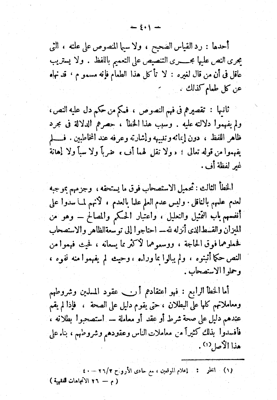 الْخَطَأُ الثَّالِثُ: تَحْمِيلُ الِاسْتِصْحَابِ فَوْقَ مَا يَسْتَحِقُّهُ، وَجَزْمُهُمْ بِمُوجَبِهِ، لِعَدَمِ عِلْمِهِمْ بِالنَّاقِلِ، وَلَيْسَ عَدَمُ الْعِلْمِ عِلْمًا بِالْعَدَمِ ... [فَنُفَاتُ الْقِيَاسِ] لَمَّا سَدُّوا عَلَى نُفُوسِهِمْ بَابَ التَّمْثِيلِ وَالتَّعْلِيلِ وَاعْتِبَارِ الْحِكَمِ وَالْمَصَالِحِ - وَهُوَ مِنْ الْمِيزَانِ وَالْقِسْطِ الَّذِي أَنْزَلَهُ اللَّهُ - احْتَاجُوا إلَى تَوْسِعَةِ الظَّاهِرِ وَالِاسْتِصْحَابِ، فَحَمَّلُوهُمَا فَوْقَ الْحَاجَةِ وَوَسَّعُوهُمَا أَكْثَرَ مِمَّا يَسَعَانِهِ، فَحَيْثُ فَهِمُوا مِنْ النَّصِّ حُكْمًا أَثْبَتُوهُ وَلَمْ يُبَالُوا بِمَا وَرَاءَهُ، وَحَيْثُ لَمْ يَفْهَمُوا مِنْهُ نَفَوْهُ، وَحَمَّلُوا الِاسْتِصْحَابَ