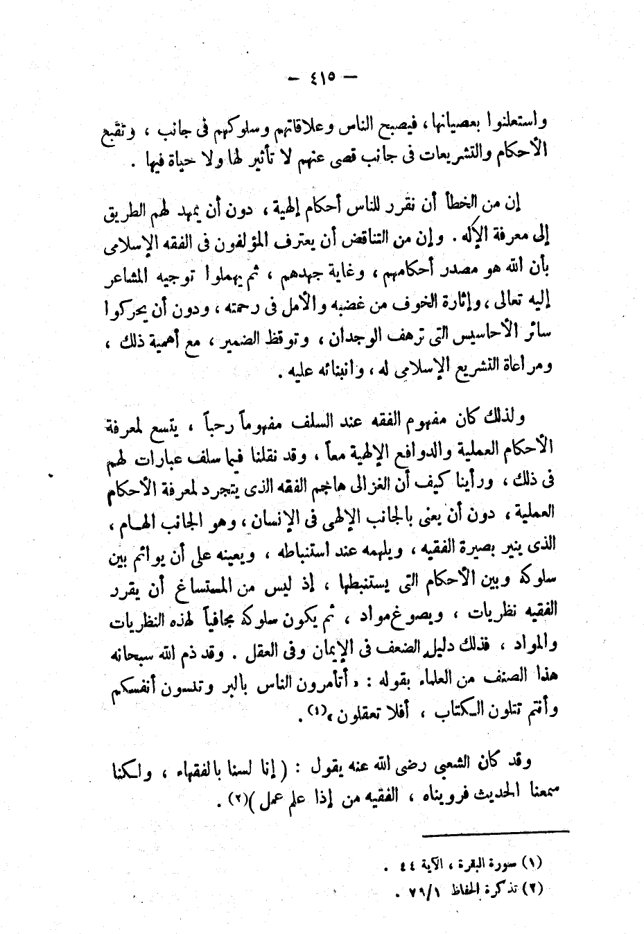 ولذلك كان مفهوم الفقه عند السلف مفهومًا رحبًا، يتسع لمعرفة الأحكام العملية والدوافع الإلهية مَعًا، وقد نقلنا فيما سلف عبارات لهم في ذلك، ورأينا كيف أن الغزالي هاجم الفقه الذي يتجرد لمعرفة الأحكام العملية، دون أن يعنى بالجانب الإلهي في الإنسان، وهو الجانب الهام الذي ينير بصيرة الفقيه، ويلهمه عند استنباطه، ويعينه على أن يوائم بين سلوكه وبين الأحكام التي يستنبطها، إذ ليس من المستساغ أن يقرر الفقيه نظريات، ويصوغ مواد، ثم يكون سلوكه مجافيًا لهذه النظريات والمواد، فذلك دليل الضعف في الإيمان وفي العقل. وقد ذم الله سبحانه هذا الصنف من العلماء بقوله: {أَتَأْمُرُونَ النَّاسَ بِالْبِرِّ وَتَنْسَوْنَ أَنْفُسَكُمْ وَأَنْتُمْ تَتْلُونَ الْكِتَابَ أَفَلاَ تَعْقِلُونَ} (١).