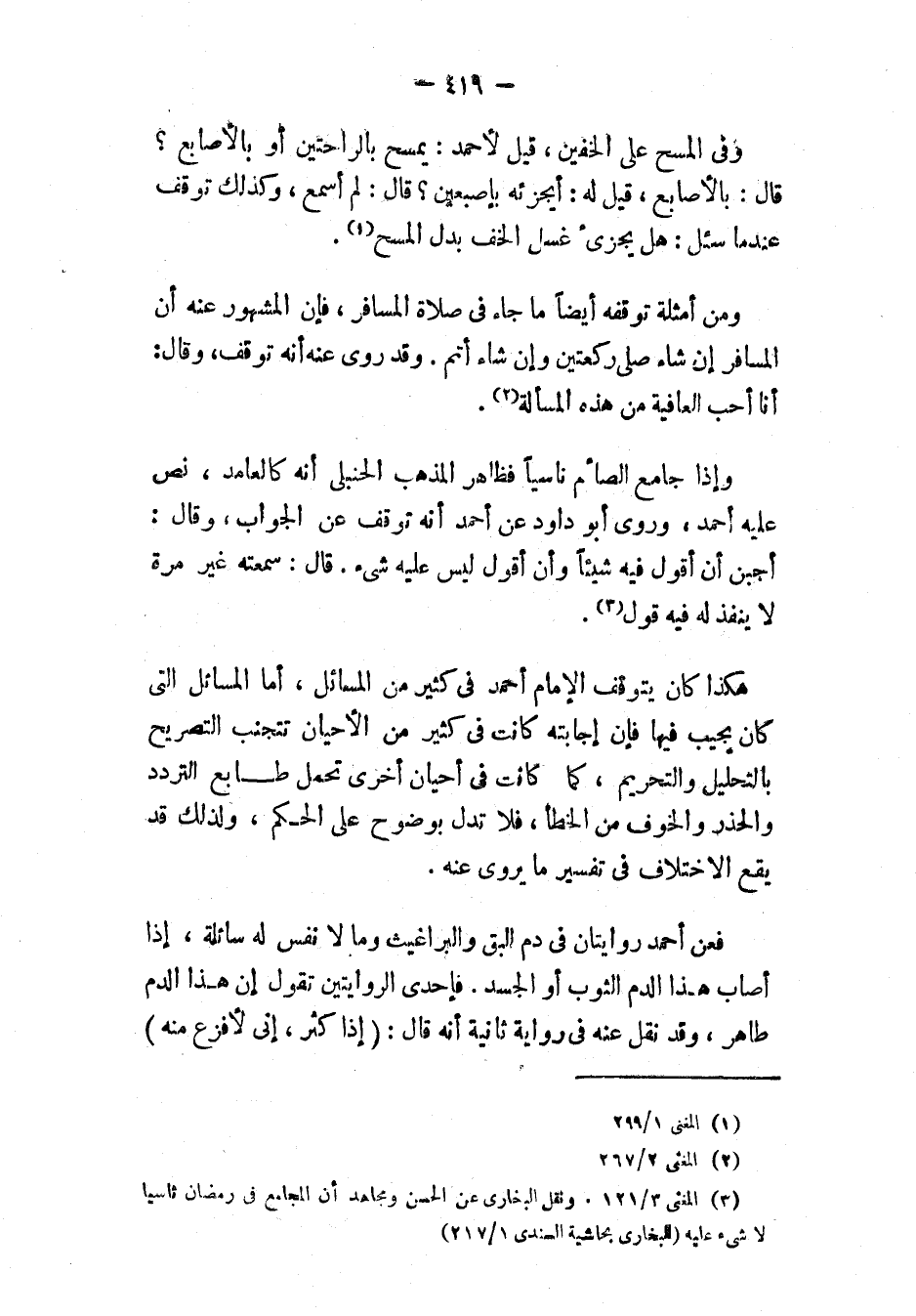 وفي المسح على الخفين، «قِيلَ لأَحْمَدَ: يَمْسَحُ بِالرَّاحَتَيْنِ أَوْ بِالأَصَابِعِ؟ قَالَ: بِالأَصَابِعِ. قِيلَ لَهُ: أَيُجْزِئُهُ بِإِصْبَعَيْنِ؟ قَالَ: لَمْ أَسْمَعْ»، وَكَذَلِكَ تَوَقَّفَ عِنْدَمَا سُئِلَ: هَلْ يُجْزِئُ غَسْلُ الخُفِّ بَدَلَ المَسْحِ (١).