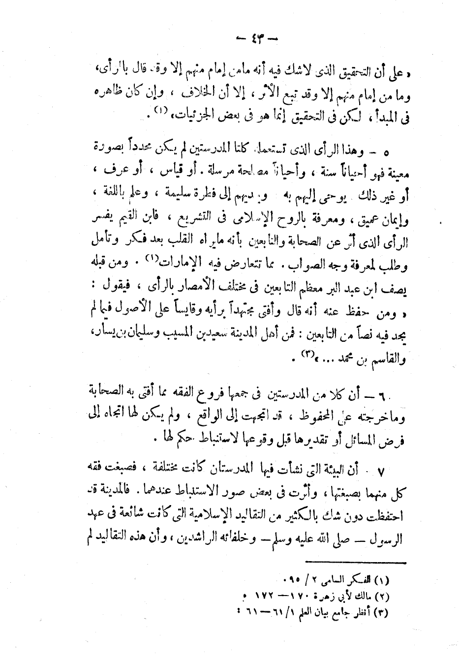 ٥ - وهذا الرأي الذي تستعمل كلتا المدرستين لم يكن محددًا بصورة معينة فهو أحيانًا سنة، وأحيانًا مصلحة مرسلة. أو قياس، أو عرف، أو غير ذلك يوحى إليهم به، ويهديهم إلى فطرة سليمة، وعلم باللغة، وإيمان عميق، ومعرفة بالروح الإسلامي في التشريع، فابن القيم يفسر الرأي الذي أثر عن الصحابة والتابعين بأنه ما يراه القلب بعد فكر وتأمل وطلب لمعرفة وجه الصواب. مما تتعارض فيه الأمارات (٢). ومن قبله يصف ابن عبد البر معظم التابعين في مختلف الأمصار بالرأي، فيقول: «وَ [مِمَّنْ] حُفِظَ عَنْهُ أَنَّهُ قَالَ وَأَفْتَى مُجْتَهِدًا رَأْيَهُ وَقَايِسًا عَلَى الْأُصُولِ فِيمَا لَمْ يَجِدْ فِيهِ نَصًّا مِنَ التَّابِعِينَ: فَمِنْ أَهْلِ المَدِينَةِ سَعِيدُ بْنُ المُسَيِّبِ، وَسُلَيْمَانُ بْنُ يَسَارٍ، وَالقَاسِمُ بْنُ مُحَمَّدٍ ...» (٣).
