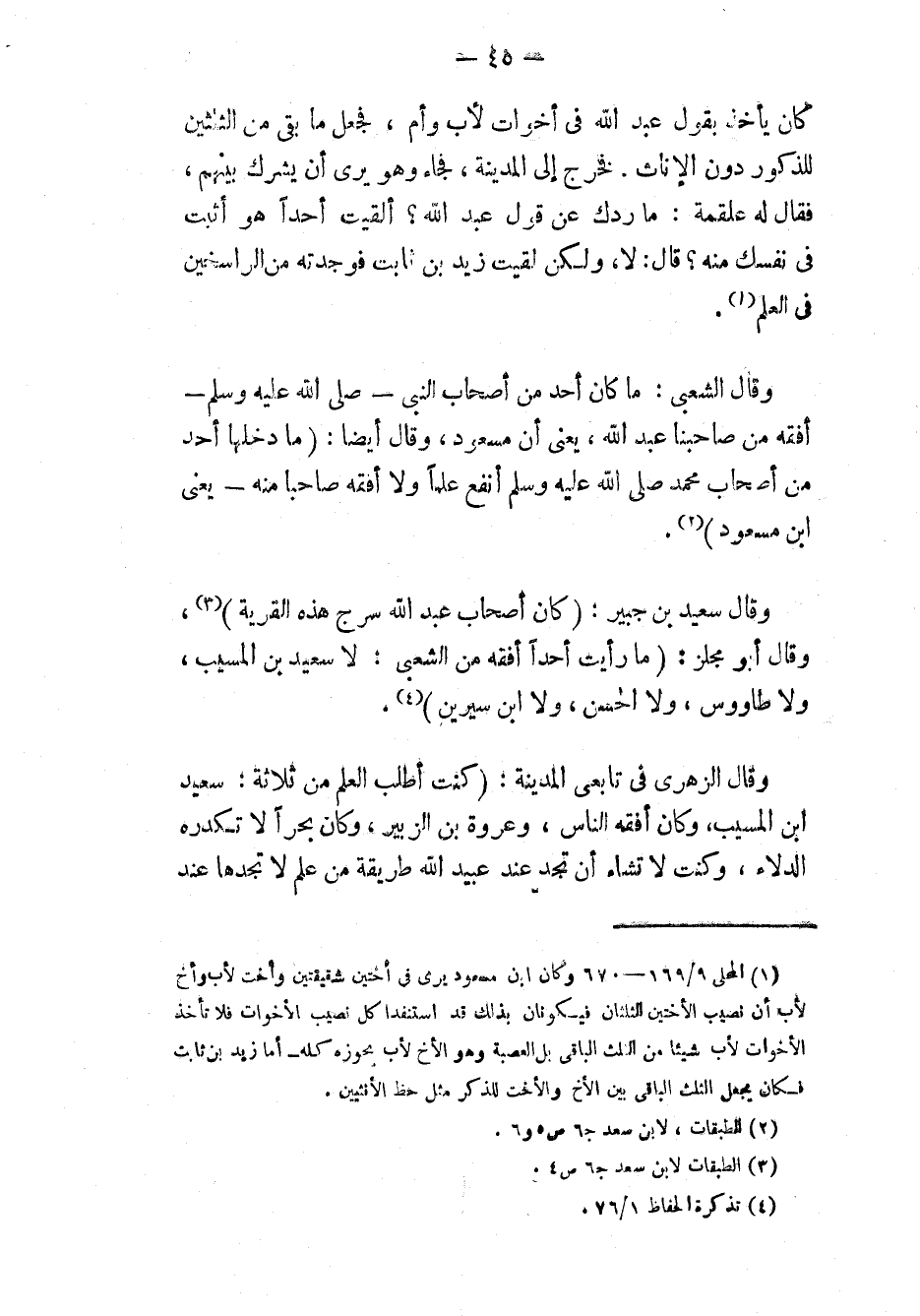 وَقَالَ سَعِيدُ بْنُ جُبَيْرٍ: «كَانَ أَصْحَابُ عَبْدِ اللهِ سَرْجَ هَذِهِ القَرْيَةِ» (٣)، وَقَالَ أَبُو مِجْلَزٍ: «مَا رَأَيْتُ أَحَداً أَفْقَهَ مِنَ الشَّعْبِيِّ، [إِلاَّ] (*) سَعِيْدَ بنَ المُسَيِّبِ، وَلَا طَاوُوسَ، وَلَا عَطَاءً، وَلَا الحَسَنَ، وَلَا ابْنَ سِيرِينَ» (٤).