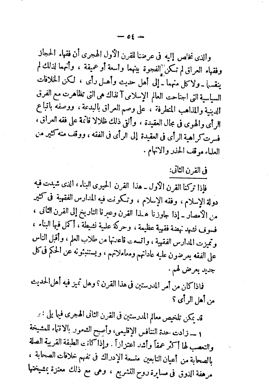 والذي نخلص إليه في عرضنا للقرن الأول الهجري أن فقهاء الحجاز وفقهاء العراق لم تكن الفجوة بينهما واسعة أو عميقة، وأنهما لذلك لم ينقسما - ولا كل منهما - إلى أهل حديث وأهل رأي، لكن الخلافات السياسية التي اجتاحت العالم الإسلامي آنذاك هي التي تظاهرت مع الفرق الدينية والمذاهب المتطرفة، على وصم العراق بالبدعة، ووصفه باتباع الرأي والهوى في مجال العقيدة، وألقى ذلك ظلالاً قائمة على فقه العراق، فسرت كراهية الرأي في العقيدة إلى الرأي في الفقه، ووقف منه كثير من العلماء موقف الحذر والاتهام.