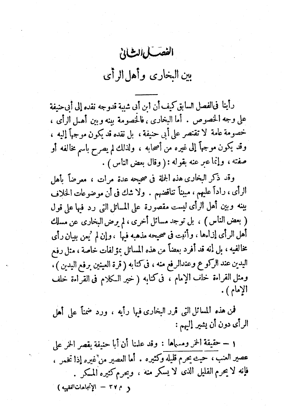 رأينا في الفصل السابق كيف أن ابن أبي شيبة قد وجه نقده إلى أبي حنيفة على وجه الخصوص. أما البخاري، فالخصومة بينه وبين أهل الرأي، خصومة عامة لا تقتصر على أبي حنيفة، بل نقده قد يكون موجهًا إليه، وقد يكون موجهًا إلى غيره من أصحابه، ولذلك لم يصرح باسم مخالفه أو صفته، وإنما عبر عنه بقوله: «وَقَالَ بَعْضُ النَّاسِ» (*).
