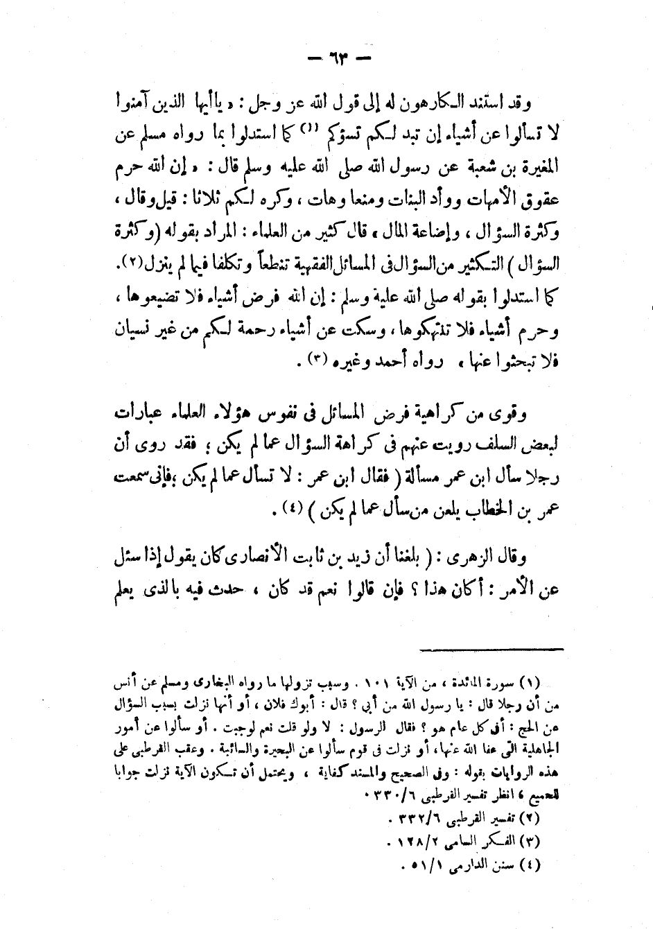 وقد استند الكارهون له إلى قول الله - عَزَّ وَجَلَّ -: {يَا أَيُّهَا الَّذِينَ آمَنُوا لَا تَسْأَلُوا عَنْ أَشْيَاءَ إِنْ تُبْدَ لَكُمْ تَسُؤْكُمْ} (١) كما استدلوا بما رواه " مسلم " عَنِ المُغِيرَةِ بْنِ شُعْبَةَ، عَنْ رَسُولِ اللَّهِ - صَلَّى اللهُ عَلَيْهِ وَسَلَّمَ - قال: «إِنَّ اللَّهَ حَرَّمَ عَلَيْكُمْ عُقُوقَ الْأُمَّهَاتِ وَوَأْدَ الْبَنَاتِ وَمَنْعًا وَهَاتِ، وَكَرِهَ لَكُمْ ثَلَاثًا: قِيلَ وَقَالَ وَكَثْرَةَ السُّؤَالِ، وَإِضَاعَةَ الْمَالِ». قال كثير من العلماء: المراد بقوله: «وَكَثْرَةَ السُّؤَالِ» التَّكْثِيرُ مِنَ السُّؤَالِ فِي المَسَائِلِ الفِقْهِيَّةِ تَنَطُّعًا وَتَكَلُّفًا فِيمَا لَمْ يَنْزِلْ (٢). كما استدلوا بقوله - صَلَّى اللهُ عَلَيْهِ وَسَلَّمَ -: «إِنَّ الله فَرَضَ أَشْيَاءَ فَلاَ تُضَيِعُوهَا، وَحَرَّمَ أَشْيَاءَ فَلاَ تَنْتَهِكُوهَا، وَسَكَتَ عَنْ أشْيَاءَ رَحْمَةً لَكُمْ غَيْرَ نِسْيَانٍ فَلاَ تَبْحَثُوا عَنْهَا». رواه أحمد وغيره (٣).