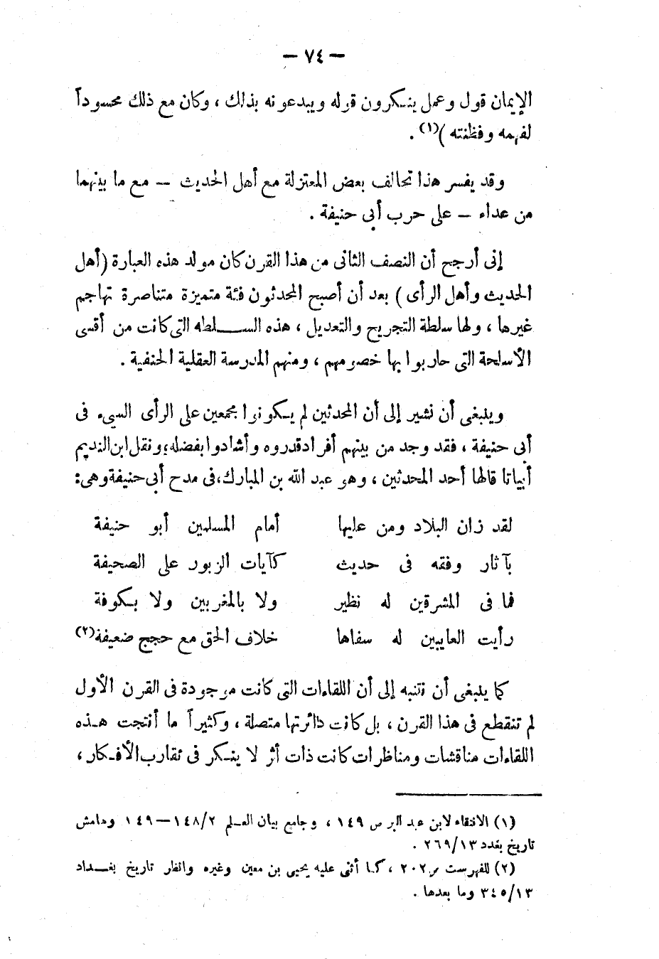 وينبغي أن نشير إلى أن المحدثين لم يكونوا مجمعين على الرأي السيء في أبي حنيفة، فقد وجد من بينهم أفراد قَدَّرُوهُ وأشادوا بفضله، ونقل ابن النديم أبياتًا قالها أحد المحدثين، وهو عبد الله بن المبارك في مدح أبي حنيفة وهي: