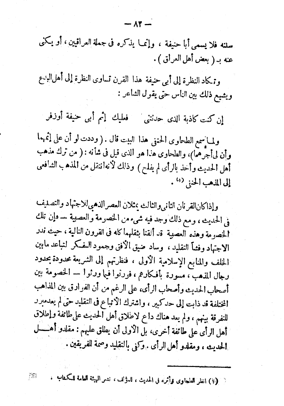 وتكاد النظرة إلى أبي حنيفة هذا القرن تساوي النظرة إلى أهل البدع ويشيع ذلك بين الناس حتى يقول الشاعر: