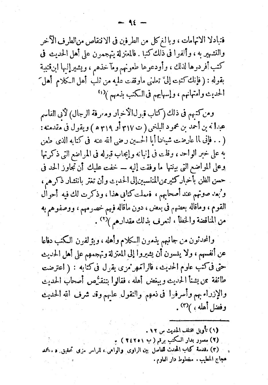 وَالمُحَدِّثُونَ مِنْ جَانِبِهِمْ يَذُمُّونَ الكَلَامَ وَأَهْلَهُ، ويؤلفون الكتب دفاعًا عن أنفسهم، ولا ينسون أن يشيروا إلى المعتزلة وتهجمهم على أهل الحديث حتى في كتب علوم الحديث، فالرامهرمزي يقول في كتابه: «اعْتَرَضَتْ طَائِفَةٌ مِمَّنْ يَشْنَأُ الحَدِيثَ وَيُبْغِضُ أَهْلَهُ، فَقَالُوا بِتَنَقُّصِ أَصْحَابِ الحَدِيثِ وَالْإِزْرَاءِ بِهِمْ، وَأَسْرَفُوا فِي ذَمِّهِمْ وَالتَّقَوُّلِ عَلَيْهِمْ، وَقَدْ شَرَّفَ اللَّهُ الحَدِيثَ وَفَضَّلَ أَهْلَهُ» (٣).