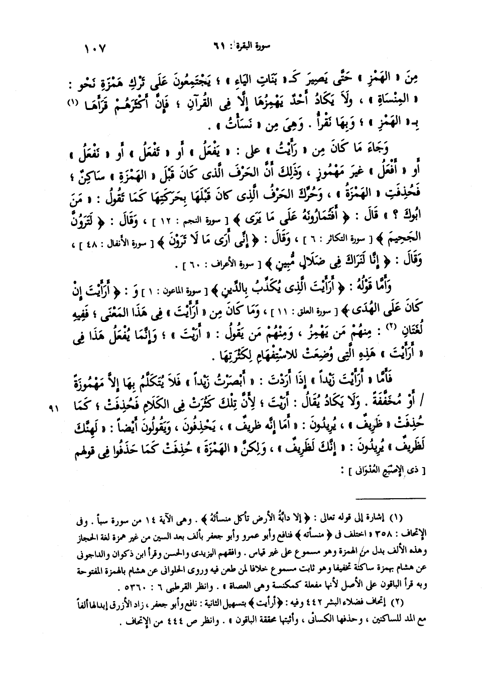 من الهمزة حتى يصير كبنات الياء، يجتمعون على ترك همزة نحو "المِنْسأَةِ" ولا يكاد أحد يهمزها الا في القرآن فان اكثرهم قرأها بالهمز وبها نقرأ، وهي من "نَسَأْتُ". وجاء ما كان من "رَأَيْتُ" على"يَفْعَلُ" أو"تَفْعَلُ" أو"نَفْعَلُ" أو"أَفْعَلُ" غير مهموز، وذلك ان الحرف الذي كان قبل الهمزة ساكن، فحذفت الهمزة وحرك الحرف الذي قبلها بحركتها كما تقول: "مَنَ ابوك". قال {أَفَتُمَارُونَهُ عَلَى مَا يَرَى} وقال {لَتَرَوُنَّ الْجَحِيمَ} وقال {إِنَّي أَرَى مَا لاَ تَرَوْنَ} وقال {إِنَّا لَنَرَاكَ فِي ضَلاَلٍ مُّبِينٍ} . واما قوله {أَرَأَيْتَ الَّذِي يُكَذِّبُ بِالدِّينِ} و {أَرَأَيْتَ إِن كَانَ عَلَى الْهُدَى} وما كان من "أَرَأَيْتَ" في هذا المعنى ففيه لغتان، منهم من يهمز ومنهم من يقول "أَريْتَ". وانما يفعل هذا في "أَرَأَيْتَ" هذه التي وضعت للاستفهام لكثرتها. فأما "أَرأَيْتَ زَيْداً" اذا أردت "أَبْصَرْتَ زَيَداً" فلا يتكلم بها إلاّ مهموزة [45ب] أو مخففة. ولا يكاد يقال "أَرَيْتَ" لأَنَّ تلك كثرت في الكلام فحذفت كما حذفت في " [أَمَانَّه] ظريف" يريدون: "أَما إِنَّه ظَريفٌ" [ف] يحذفون ويقولون أيضاً "لَهِنَّكَ لَظَريفٌ" يريدون: " [لـ] إنَّكَ لَظَريفٌ". ولكن الهمزة حذفت كما حذفوا في قولهم:
