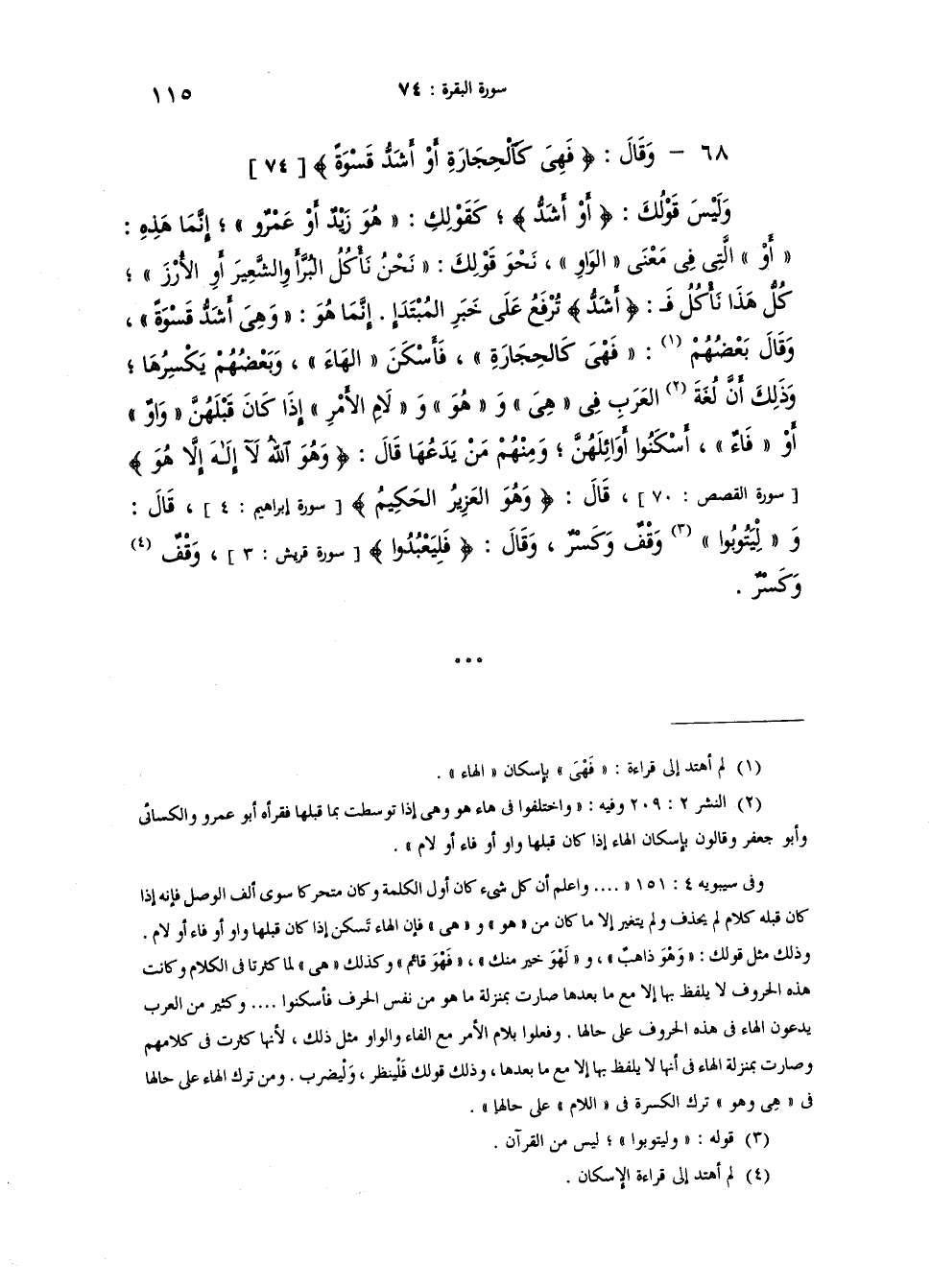 قال {فَهِيَ كَالْحِجَارَةِ أَوْ أَشَدُّ قَسْوَةً} وليس قوله: {أَوْ أَشَدُّ} كقولك: "هُوَ زيدٌ أو عمرو" إنّما هذه {أَوْ} التي في معنى الواو، نحو قولك: "نَحْنُ نأكُل البُرَّ أَوْ الشَعير أو الأُرُزَّ، كلَّ هذا نَأْكُلُ" فـ {أَشَدُّ} ترفع على خبر المبتدأ. وانما هو "وهي أشدُّ قَسْوَةً" وقال بعضهم {فَهْيَ كالحِجارَةِ} فأسكن الهاء وبعضهم يكسرها. وذلك ان لغة العرب في "هيَ" و"هَو" ولام الأمر اذا كان قبلهن واو أو فاء أسكنوا أوائلهن. ومنهم من يدعها. قال {وَهُوَ اللَّهُ لا اله إِلاَّ هُوَ} [و] قال {وَهُوَ الْعَزِيزُ الْحَكِيمُ} . [و] قال {وَلْيتوبوا} وقف وكسر. وقال {فَلْيَعْبُدُواْ} . وقف وكسر.