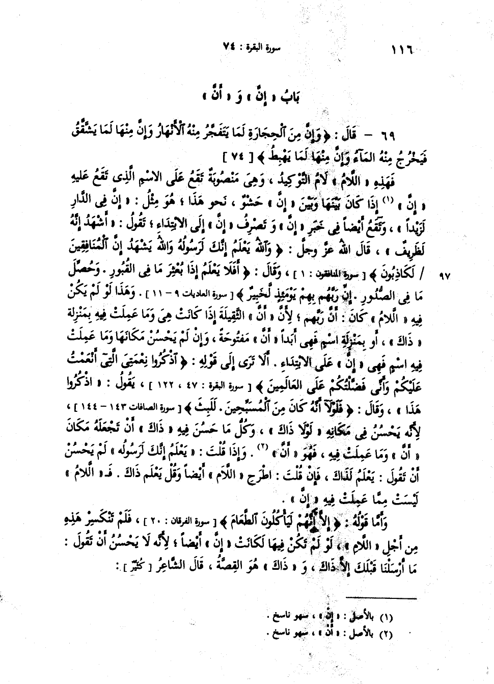 قال {وَإِنَّ مِنَ الْحِجَارَةِ لَمَا يَتَفَجَّرُ مِنْهُ الأَنْهَارُ وَإِنَّ مِنْهَا لَمَا يَشَّقَّقُ فَيَخْرُجُ مِنْهُ الْمَآءُ وَإِنَّ مِنْهَا لَمَا يَهْبِطُ} فهذه اللاّم لام التوكيد وهي منصوبة تقع على الاسم الذي تقع عليه "إنَّ" اذا كان بينها وبين "إِنَّ" حشو نحو هذا. [و] هو مثل: "إنَّ في الدارِ لَزَيْداً". وتقع أيضاً في خبر "إنَّ" وتصرف "إِنَّ" الى الابتداء، تقول: "أَشْهَدُ إنَّهُ لَظَريفٌ "قال الله عزَّ وجلِ {وَاللَّهُ يَعْلَمُ إِنَّكَ لَرَسُولُهُ وَاللَّهُ يَشْهَدُ إِنَّ الْمُنَافِقِينَ [48ب] لَكَاذِبُونَ} وقال {أَفَلاَ يَعْلَمُ إِذَا بُعْثِرَ مَا فِي الْقُبُورِ [9] وَحُصِّلَ مَا فِي الصُّدُورِ [10] إِنَّ رَبَّهُم بِهِمْ يَوْمَئِذٍ لَّخَبِيرٌ} وهذا لو لم تكن فيه اللام كان "أَنَّ رَبَّهُمْ" لان "أنَّ" الثقيلة اذا كانت هي وما عملت فيه بمنزلة "ذاكَ" أوْ بمنزلة اسم فهي أبدا "أَنَّ" مفتوحة. وإنْ لم يحسن مكانها وما عملت فيه اسم فهي "إنَّ" على الابتداء. ألا ترى إلى قوله {اذْكُرُواْ نِعْمَتِي الَّتِي أَنْعَمْتُ عَلَيْكُمْ وَأَنِّي فَضَّلْتُكُمْ عَلَى الْعَالَمِينَ} يقول: "اذْكُرُوا هذا" وقال {فَلَوْلاَ أَنَّهُ كَانَ مِنَ الْمُسَبِّحِينَ لَلَبِثَ} لانه يحسن في مكانه "لولا ذاكَ" وكل ما حسن فيه "ذاك" أنْ تجعله مكان "أنَّ" وما عملت فيه فهو "أَنَّ". واذا قلت {يَعْلَمُ إِنَّكَ لَرَسُولُهُ} لم يحسن أَنْ تقول: "يَعْلَم لَذالِكَ". فان قلت: "اِطْرح اللام أَيضاً وقل "يُعْلَمُ ذَاكَ" فاللام ليست مما عملت فيه "إِنّ". واما قوله {إِلاَّ إِنَّهُمْ لَيَأْكُلُونَ الطَّعَامَ} فلم تنكسر هذه من اجل اللام [و] لو لم تكن فيها لكانت "إنَّ" أيْضاً لأَنَّهُ لا يحسن أَنْ تقول "ما أَرْسَلْنا قَبْلَكَ إلاّ ذَاكَ" و"ذاكَ" هو القصة. قال الشاعر: [من المنسرح وهو الشاهد التاسع والثمانون] :