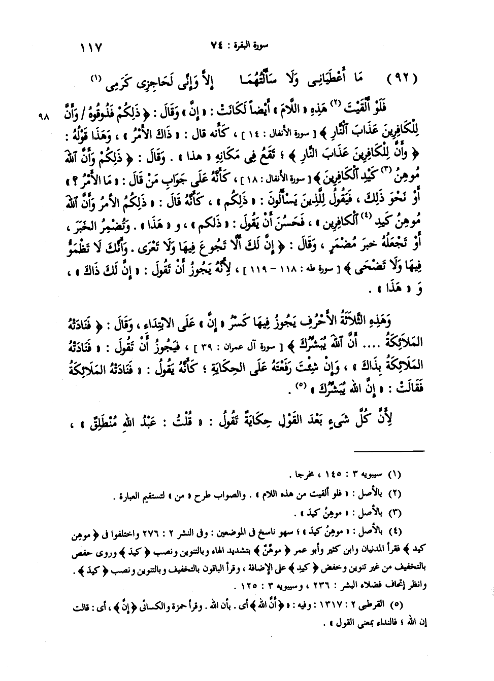 فلو أُلْقِيَتْ من هذه اللامَ ايضاً لكانت "أَن". وقال {ذالِكُمْ فَذُوقُوهُ [49ء] وَأَنَّ لِلْكَافِرِينَ عَذَابَ النَّارِ} كأنه قال: "ذاكَ الأمْر" وهذا قوله {وَأَنَّ لِلْكَافِرِينَ عَذَابَ النَّارِ} تقع في مكانه "هذا". وقال {ذالِكُمْ وَأَنَّ اللَّهَ مُوهِنُ كَيْدِ الْكَافِرِينَ} كأنه على جواب من قال: "ما الأَمْرُ"؟ أو نحو ذلك فيقول للذين يسألون: "ذلك م ... " كأنه قال: "ذلِكُمْ الأمرُ وأَنَّ اللهَ موهنُ كيدِ الكافرين" فحسن أن يقول: "ذلك م" و"هذا". وتضمر الخبر او تجعله خبر مضمر. وقال {إِنَّ لَكَ أَلاَّ تَجُوعَ فِيهَا وَلاَ تَعْرَى} {وَأَنَّكَ لاَ تَظْمَأُ فِيهَا وَلاَ تَضْحَى} لانه يجوز ان تقول: "إنَّ لَكَ ذاكَ" و"هذا" وهذه الثلاثة الأحرفُ يجوز فيها كسر "إِنَّ" على الابتداء. {فَنَادَتْهُ الْمَلائِكَةُ. . أَنَّ اللَّهَ يُبَشِّرُكَ} فيجوز أن تقول: "فنادته الملائكة بِذاكَ" وان شئت رفعته على الحكاية كأنه يقول: "فنادَتْهُ الملائكةُ فَقالَتْ: "إِنَّ اللهُ يُبَشِّرُكَ" لأنَّ كُلَّ شيء بعدَ القولِ حكاية، تقول: "قُلْتُ: "عبدُ اللهِ مُنْطَلِقٌ"