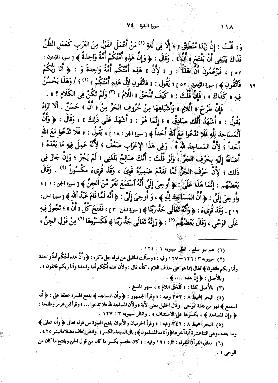 وقلت: "إنَّ عبدَ اللهِ زيداً مُنْطَلِقٌ" إلاَّ في لُغَةِ من أعمل القول من العرب كعمل الظن فذاك ينبغي [له] أنْ يفتح "أَنَّ". وقال {إِنَّ هَاذِهِ أُمَّتُكُمْ أُمَّةً وَاحِدَةً} فيزعمون أنَّ هذا "ولأنَّ هذهِ أمَّتَكُم أُمَّةٌ واحدةٌ وَأَنَا رَبُّكُّمْ فَاتَّقُونِ" يقول: "فَاتَّقُون لأَنَّ هذِهِ أُمَّتَكُمْ" [49ب] وهذا يحسن فيه كذاك، فان قلت: "كيف تلحق اللام ولم تكن في الكلام". فان طرح اللام واشباهها من حروف الجرّ من "أَنَّ" حسن ألا تراه يقول "أَشْهد أَنَّك صادِقٌ" وإنَّما هو "أشهد على ذلك ". وقال {وَأَنَّ الْمَسَاجِدَ لِلَّهِ فَلاَ تَدْعُواْ مَعَ اللَّهِ أَحَداً} يقول: "فلا تدعوا مع الله