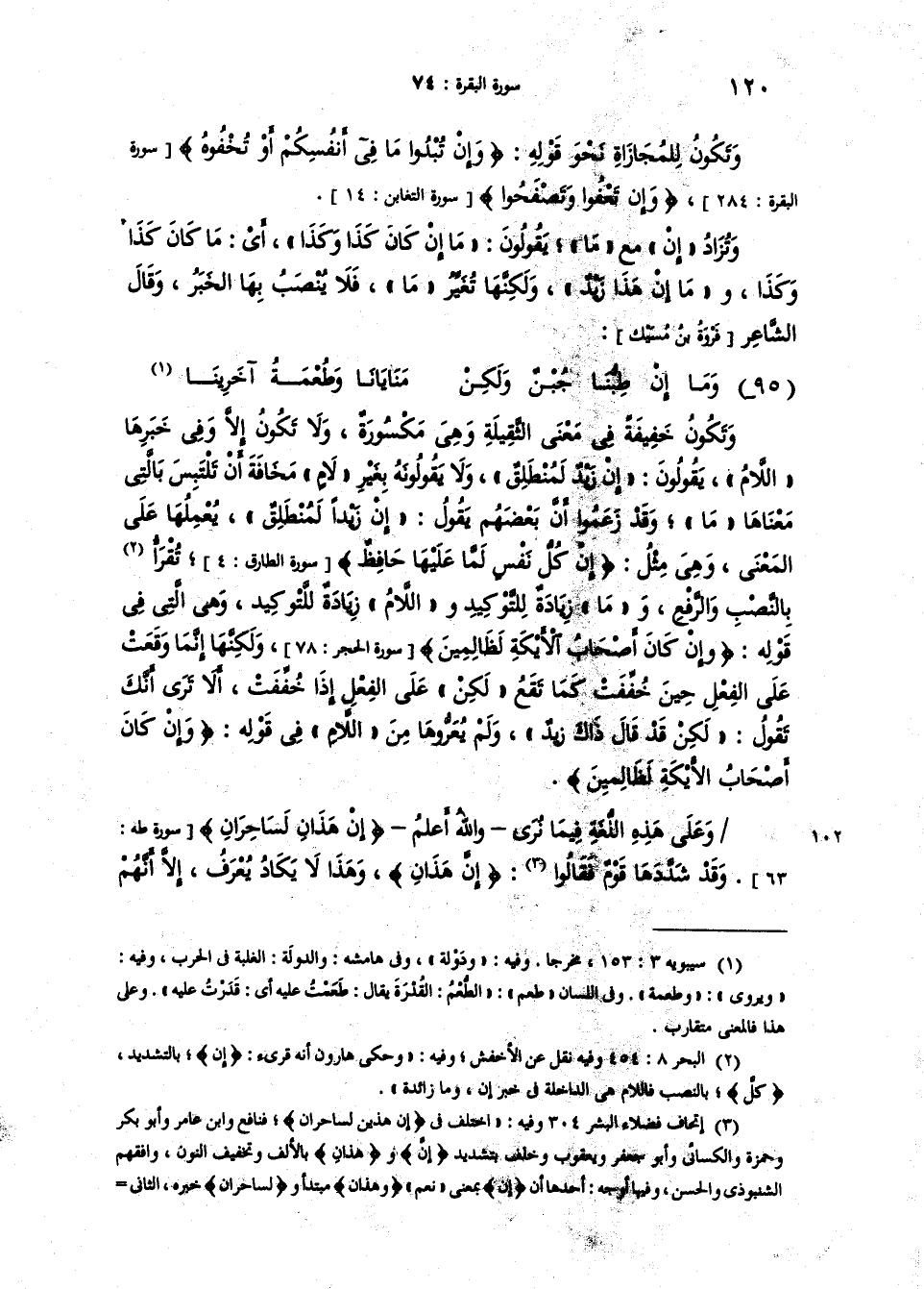 وتكون خفيفة في معنى الثقيلة وهي مكسورة ولا تكون إلاَّ وفي خبرها اللام، يقولون: "إنْ زَيْدٌ لَمنطلِقٌ" ولا يقولونه بغير لام مخافة ان تلتبس بالتي معناها "ما". وقد زعموا ان بعضهم يقول: "إنْ زيداً لمَنُْطَلِقٌ" يعملها على المعنى وهي مثل {إِن كُلُّ نَفْسٍ لَّمَّا عَلَيْهَا حَافِظٌ} يقرأ بالنصب والرفع و "ما" زيادة للتوكيد، واللام زيادة للتوكيد وهي التي في قوله {وَإِن كَانَ أَصْحَابُ الأَيْكَةِ لَظَالِمِينَ} ولكنها انما وقعت على الفعل حين خففت كما تقع "لكنْ" على الفعل إذا خففت. ألا ترى أنك تقول: "لكن قد قال ذاك زيد". ولم يُعَرُّوها من اللام في قوله {وَإِن كَانَ أَصْحَابُ الأَيْكَةِ لَظَالِمِينَ} [51ء] وعلى هذه اللغة فيما نرى - والله أعلم - {إِنْ هَاذَانِ لَسَاحِرَانِ} وقد شددها قوم فقالوا {إنّ هذانِ} وهذا لا يكاد يعرف إلا أنهم