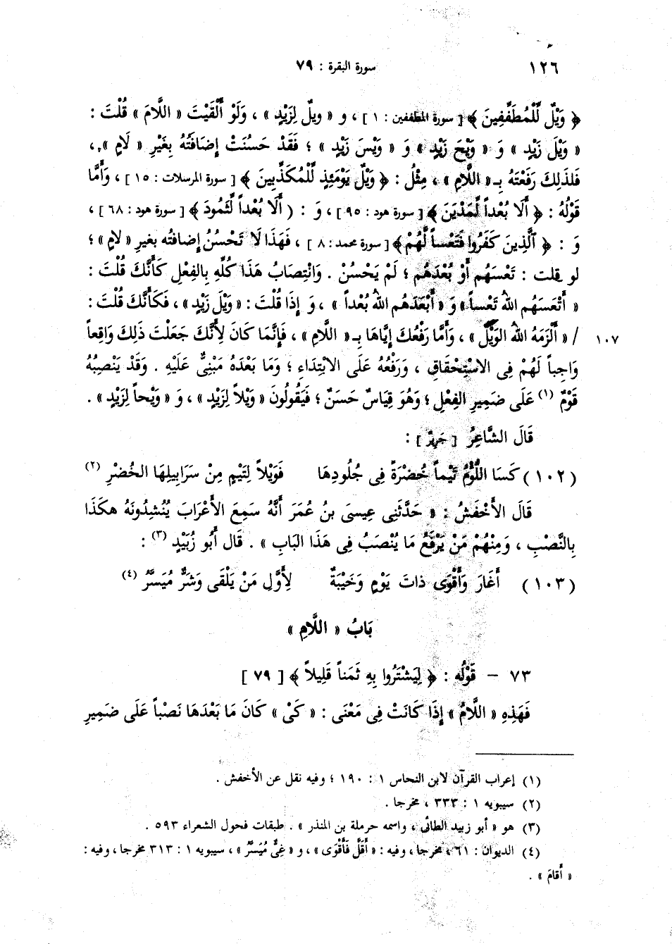 قال الاخفش: "حدثني عيسى بن عمر أنه سمع الاعراب ينشدونه هكذا بالنصب, ومنهم من يرفع ما ينصب في هذا الباب. قال أبو زُبَيدَ: [من الطويل وهو الشاهد المئة] :
