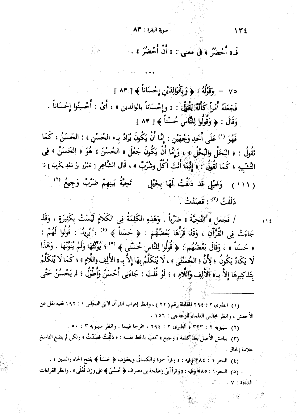 وقال {وَقُولُواْ لِلنَّاسِ حُسْناً} فهو على أحد وجهين إمّا أَنْ يكون يراد بـ"الحُسْنِ" "الحَسَنَ" كما تقول: "البُخْل" و"البَخلَ"، وإمّا أنْ يكونَ جعل "الحُسْنَ" هو "الحَسَنَ" في التشبيه كما تقول: "إنَّما أَنْتَ أَكلٌ وشُرْبٌ". قال الشاعر: [من الوافر وهو الشاهد الثامن بعد المئة] :