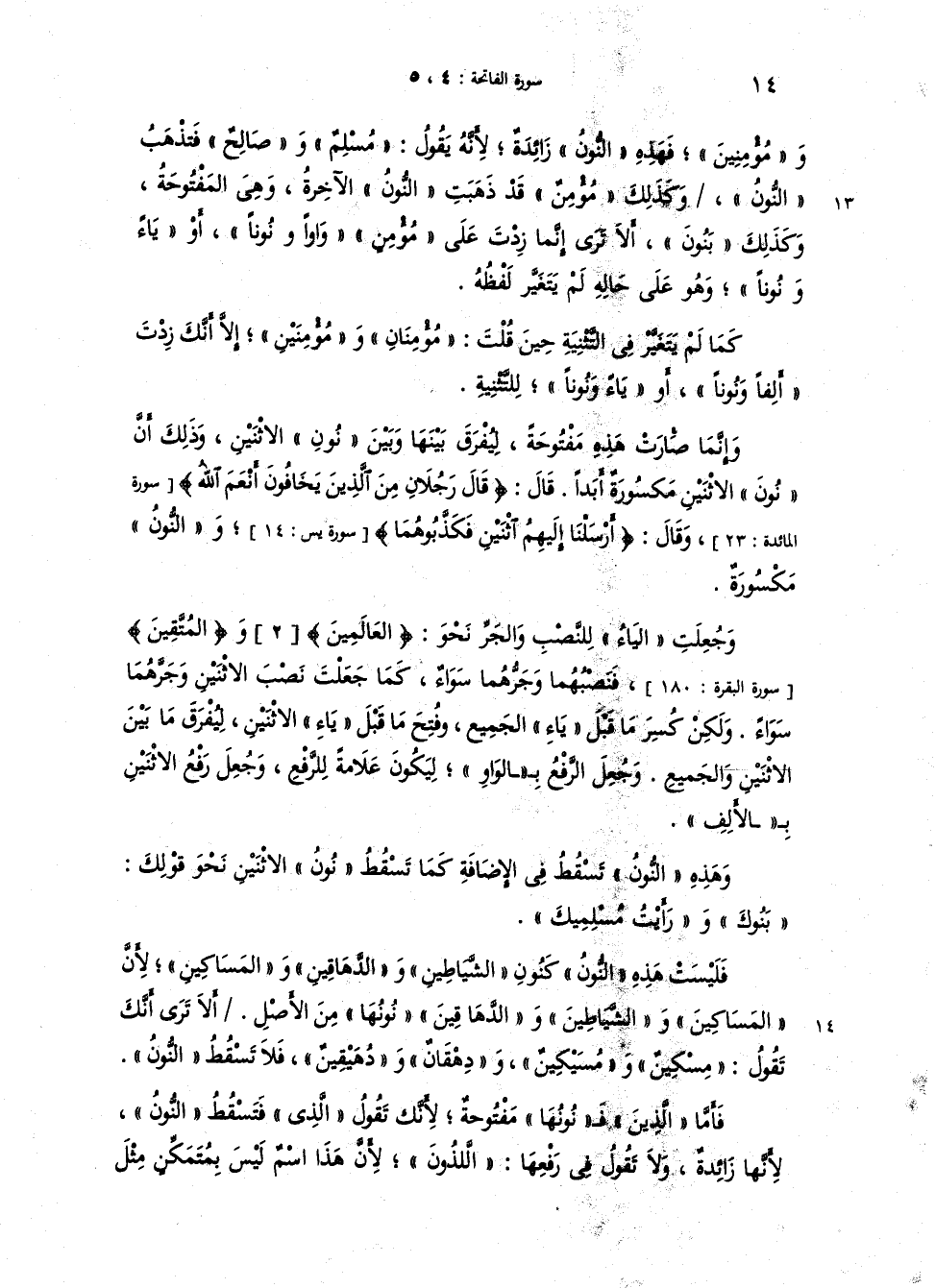 و "مؤمنين" فهذه النون زائدة لأنك تقول: "مسلم" و "صالح" فتذهب النون [6ب] ، وكذلك "مؤمن" قد ذهبت النون الآخرة، وهي المفتوحة، وكذلك "بنون". ألا ترى [انك] انما زدت على "مؤمن" واوا ونونا, وياء ونونا, وهو على حاله لم يتغير لفظه، كما لم يتغير في التثنية حين قلت "مؤمنان" و "مؤمنين". الاّ انك زدت ألفا ونونا، أو ياء ونونا للتثنية. وانما صارت هذه مفتوحة ليفرق بينهما وبين نون الاثنين. وذلك أن نون الاثنين مكسورة أبدا. قال: {قَالَ رَجُلاَنِ مِنَ الَّذِينَ يَخَافُونَ أَنْعَمَ اللَّهُ} وقال {أَرْسَلْنَآ إِلَيْهِمُ اثْنَيْنِ فَكَذَّبُوهُمَا} والنون مكسورة.