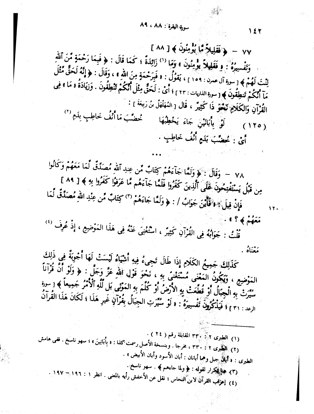 قال {وَلَمَّا جَآءَهُمْ كِتَابٌ مِّنْ عِندِ اللَّهِ مُصَدِّقٌ لِّمَا مَعَهُمْ وَكَانُواْ مِن قَبْلُ يَسْتَفْتِحُونَ عَلَى الَّذِينَ كَفَرُواْ فَلَمَّا جَآءَهُمْ مَّا عَرَفُواْ كَفَرُواْ بِهِ} فان قيل فأين جواب {وَلَمَّا جَآءَهُمْ [60ء] كِتَابٌ مِّنْ عِندِ اللَّهِ مُصَدِّقٌ لِّمَا مَعَهُمْ} قلت: "جوابه في القرآن كثير، [و] استغني عنه في هذا الموضع اذ عرف معناه. كذلك جميع الكلام إذا طال تجيء فيه أشياء ليس لها أجوبة في ذلك الموضع ويكون المعنى مستغنى به ** نحو قول الله عز وجل {وَلَوْ أَنَّ قُرْآناً سُيِّرَتْ بِهِ الْجِبَالُ أَوْ قُطِّعَتْ بِهِ الأَرْضُ أَوْ كُلِّمَ بِهِ الْمَوْتَى بَل للَّهِ الأَمْرُ جَمِيعاً} فيذكرون [ان] تفسيره: "لَوْ سُيِّرَتْ الجِبالُ بقرآنٍ غيرِ هذا لَكَانَ هذا القرآنُ