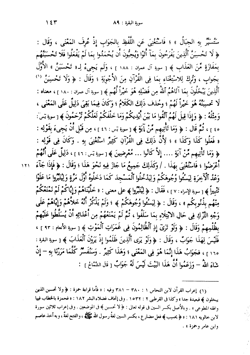 سَتُسَيَّر بِهِ الجِبالُ" فاستُغْنِيَ عن اللَّفْظِ بالجَوابِ إذْ عُرِفَ المَعْنى. وقال {لاَ تَحْسَبَنَّ الَّذِينَ يَفْرَحُونَ بِمَآ أَتَوْاْ وَّيُحِبُّونَ أَن يُحْمَدُواْ بِمَا لَمْ يَفْعَلُواْ فَلاَ تَحْسَبَنَّهُمْ بِمَفَازَةٍ مِّنَ الْعَذَابِ} ولم يجيء لـ"تحسَبَنَّ" الأول بجواب وتُرِكَ للاستغناءِ بما في القرآن من الأجوبة. وقال {وَلاَ يَحْسَبَنَّ الَّذِينَ يَبْخَلُونَ بِمَآ آتَاهُمُ اللَّهُ مِن فَضْلِهِ هُوَ خَيْراً لَّهُمْ} معناه "لا يَحَسَبُنَّهُ خَيْراً لَهُمْ" وحذف ذلك الكلام وكان فيما بقي دليل على المعنى. ومثله {وَإِذَا قِيلَ لَهُمُ اتَّقُواْ مَا بَيْنَ أَيْدِيكُمْ وَمَا خَلْفَكُمْ لَعَلَّكُمْ تُرْحَمُونَ} ثم قال {وَمَا تَأْتِيهِم مِّنْ آيَةٍ} من قبل أن يجيء بقوله "فَعَلُوا كَذا وَكَذا" لان ذلك في القرآن كثير، استغني به. وكان في قوله {وَمَا تَأْتِيهِم مِّنْ آيَةٍ مِّنْ آيَاتِ رَبِّهِمْ إِلاَّ كَانُواْ عَنْهَا مُعْرِضِينَ} دليل على أَنَّهُمْ أعرَضُوا فاستغني بهذا [60ب] وكذلك جميع ما جاز