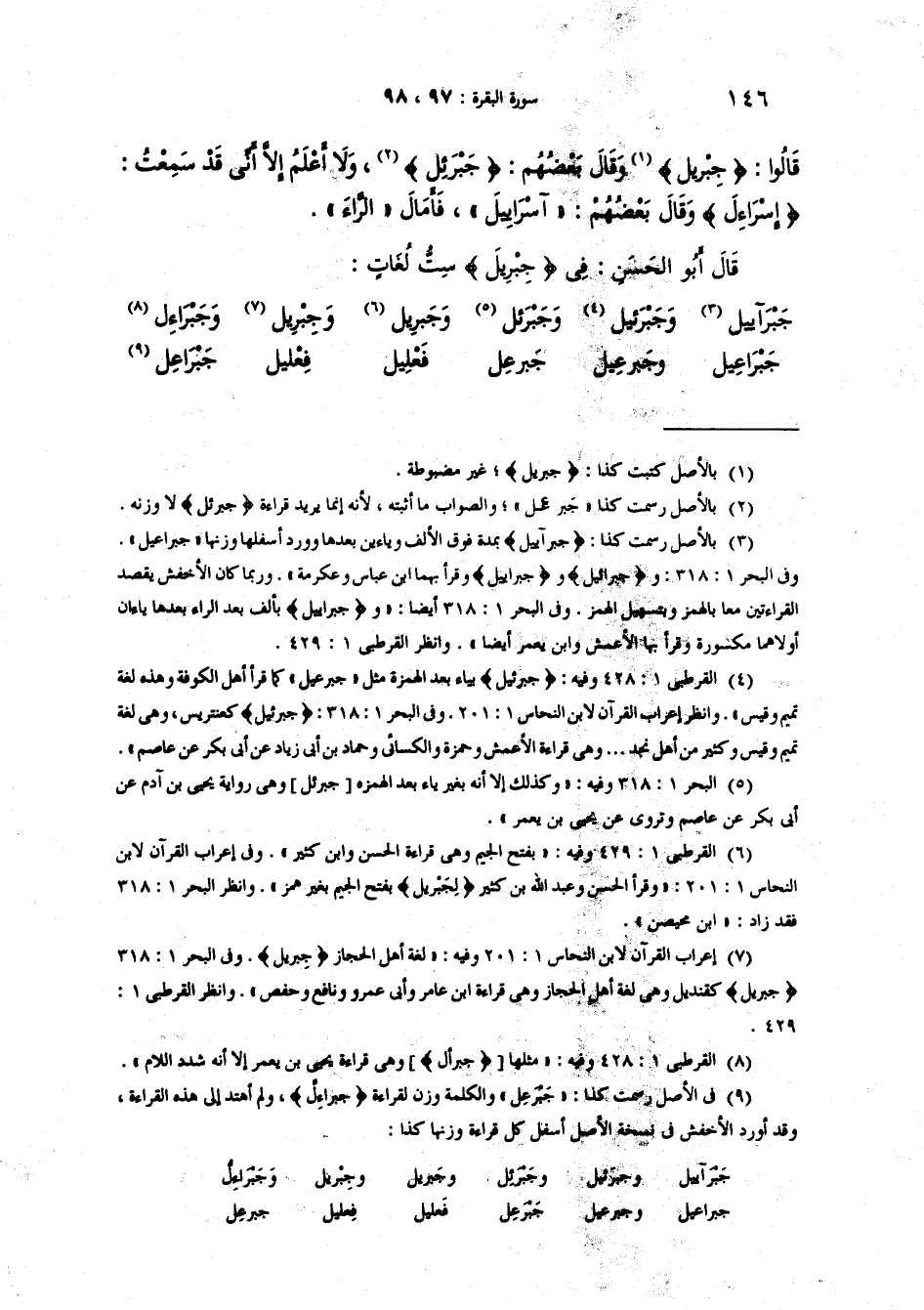 قالوا {جِبْرِيل} . وقال بعضهم {جبرعَل} ولا أعلم [وجهه] الا أني قد سَمِعت {إِسرائِل} وقال بعضهم {إسْرِييلِ} فأمال الراء. قال أبو الحسن: "في" "جبريل" "ست لغات: جَبْراييل وجَبْرَئيل وجَبْرئِلْ جَبْراعيل جَبْرَعِيل جَبرعل وجَبْريل وجِبريلَ فَعليل فِعليل وجَبْرائِل. جبراعل.