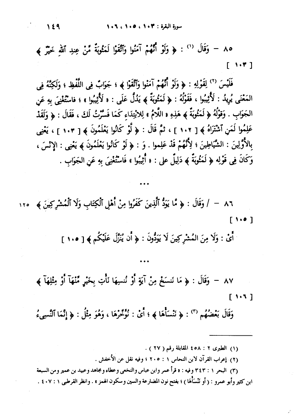 قال {مَا نَنسَخْ مِنْ آيَةٍ أَوْ نُنسِهَا نَأْتِ بِخَيْرٍ مِّنْهَا أَوْ مِثْلِهَا} وقال بعضهم {نَنْسَأْها} أي نُؤَخِّرْها، وهو مثل {إِنَّمَا النَّسِيءُ