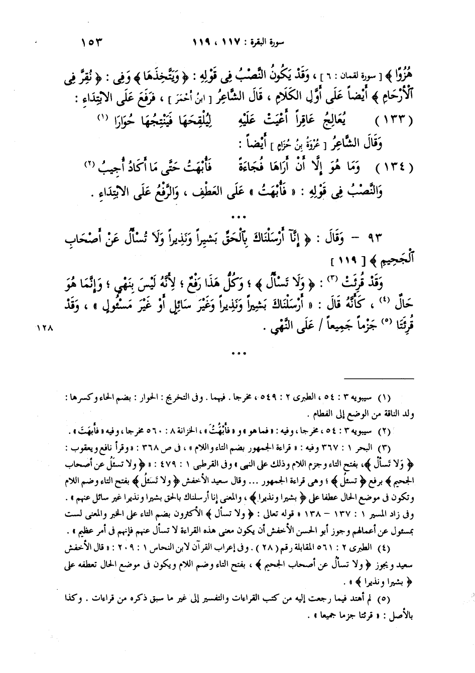 قال {إِنَّا أَرْسَلْنَاكَ بِالْحَقِّ بَشِيراً وَنَذِيراً وَلاَ تُسْأَلُ عَنْ أَصْحَابِ الْجَحِيمِ} وقد قرئت {ولا تَسْأَلُ} وكلّ هذا رفعٌ لأنه ليس بنهيٍ وإنَّما هو حال كأنه قال "ارْسَلناكَ بشيراً ونذيراً وغيرَ سائِلٍ أو غيرَ مَسؤْول" وقد قرئتا جزما جميعا [64ء] على النهي.