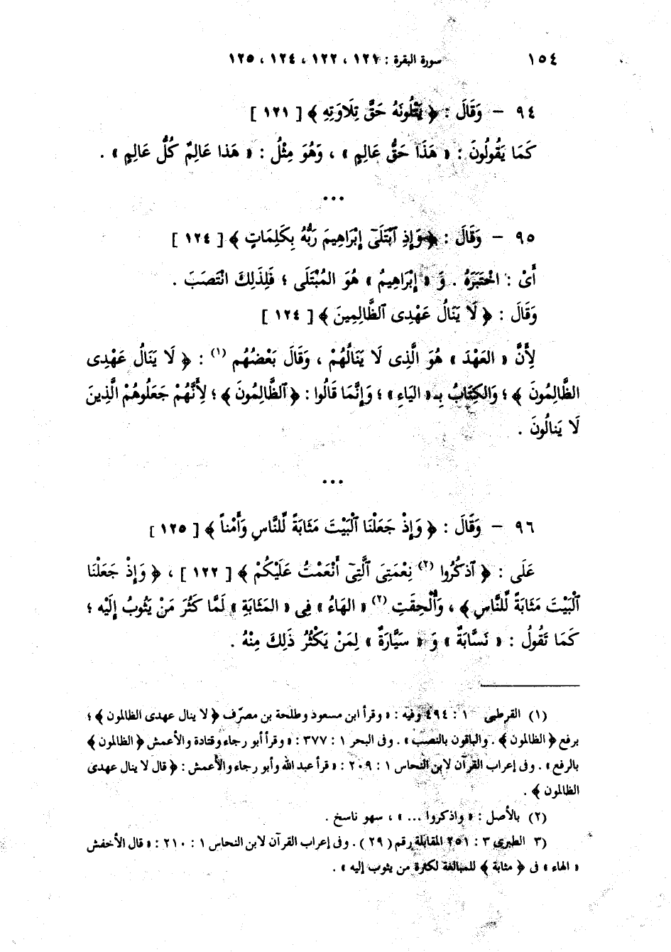 قال {وَإِذْ جَعَلْنَا الْبَيْتَ مَثَابَةً لِّلنَّاسِ وَأَمْناً} على {اذْكُرُواْ نِعْمَتِي الَّتِي أَنْعَمْتُ عَلَيْكُمْ} [122] {وَإِذْ جَعَلْنَا الْبَيْتَ مَثَابَةً لِّلنَّاسِ} وأُلْحِقَتْ الهاءُ في "المَثابة" لما كُثُر مَنْ يَثُوب اليه كما تقول: "نَسَّابَة" و"سيّارَة" لِمَنْ يكثُر ذلك منه.
