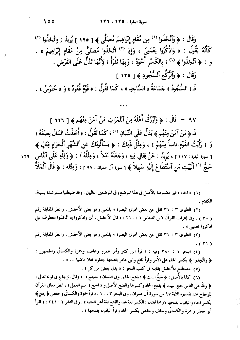 وقال {وَاتَّخِذُواْ مِن مَّقَامِ إِبْرَاهِيمَ مُصَلًّى} يُريدُ {واتَّخَذُوا} كَأَنَّهُ يقولُ "واذْكُروا نِعْمَتي وإذْ اتَّخَذُوا مُصَلى من مَقامِ إبراهيمَ" و {اتخَِّذُوا} بالكسر وبها نقرأ لأنَّها تدلّ على الغَرْض.