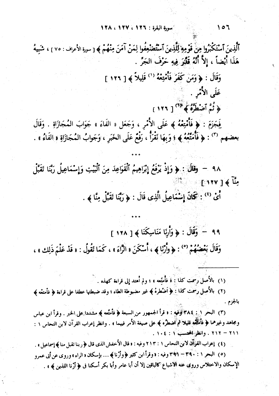 وقال {وَمَن كَفَرَ فَأُمَتِّعُهُ قَلِيلاً} على الامر {ثُمَّ أَضْطَرُّهُ} فجزم {فَأَمْتِعْهُ} على الأمر وجعل الفاء جواب المجازاة. وقال بعضهم {فَأُمَتِّعُهُ} وبها نقرأ رفع على الخبر وجواب المجازاة الفاء.