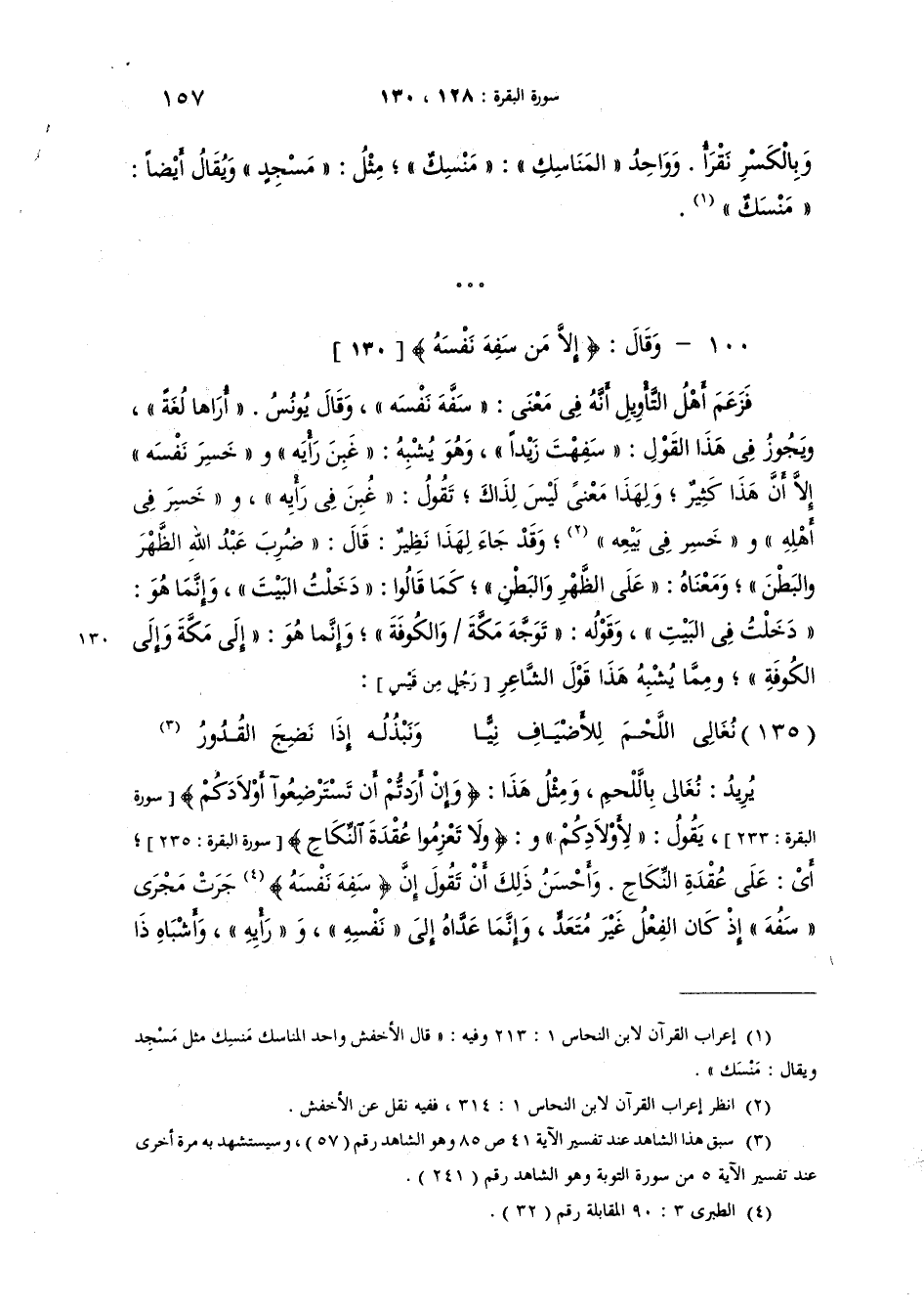 قال {إِلاَّ مَن سَفِهَ نَفْسَهُ} فزعم أَهل التأويل انه في معنى: "سَفَّهَ نفسَه" وقال يونس: "أُراها لُغَة". ويجوز في هذا القول: "سِفِهْتُ زَيْداً"، وهو يشبه "غِبَنَ رأيَه" و"خَسِرَ نَفْسَه" الا ان هذا كثير، ولهذا معنى ليس لذاك. تقول: "غِبَنَ فيَ رأيِهِ" و"خَسِرَ في أَهْلِهِ" و"خَسِرَ في بيعِه". وقد جاء لهذا نظير، قال: "ضُرِبَ عبدُ اللهِ الظهرَ والبَطْنَ" ومعناه: على الظهر والبطن" كما قالوا: "دَخَلْتُ البيتَ" وإنما هو "دَخَلْتُ في البيتِ". وقوله: "تَوَجَّهَ مَكَّةَ [65ء] والكُوفَةَ" وانما هو: إلى مَكَّة والكُوفَةِ. ومما يشبه هذا قول الشاعر: [من الوافر وهو الشاهد السادس والخمسون] :