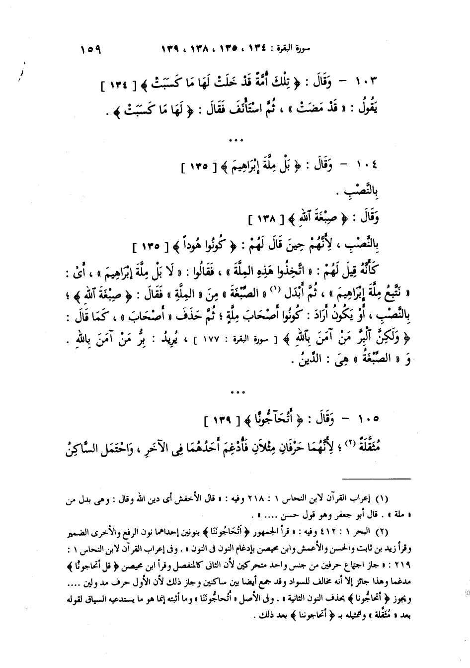 قال {صِبْغَةَ اللَّهِ} بالنصب. لانهم حين قالوا* لهم {كُونُواْ هُوداً} [135] كأنه قيل لهم: "اتَّخِذُوا هِذِهِ المِلَّةَ" فقالوا: "لا {بَلْ مِلَّةَ إِبْرَاهِيمَ} أي: نَتَّبِعُ مِلَّةَ إبْراهيم، ثم أبدل "الصِّبْغَةَ" من "المِلَّة" فقال {صِبْغَةَ اللَّهِ} بالنصب. او يكون أراد: "كونوا أصحابَ مِلَّةٍ" ثم حذف "أَصْحاب" كما قال: {ولكنَّ الْبِرَّ مَنْ آمَنَ بِاللَّهِ} يريد: "بِرَّ مَنْ آمَن باللهِ". والصِِّبْغَةُ: هي الدين.