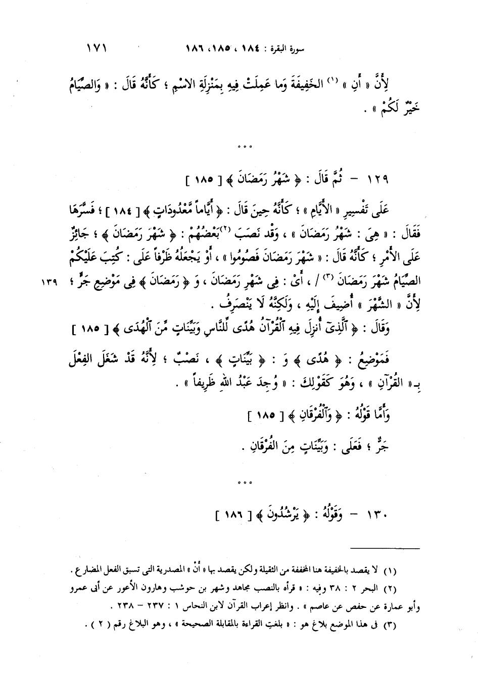 ثم قال {شَهْرُ رَمَضَانَ} على تفسير الايام، كأنه حين قال {أَيَّاماً مَّعْدُودَاتٍ} فسرها فقال: "هِيَ شَهْرُ رَمَضَانَ". وقد نصب بعضهم {شَهْرَ رَمَضانَ} [وذلك] * جائز على الامر، كأنه قال: "شَهْرَ رَمضانَ فصُوموا"، أو جعله ظرفا على {كُتِبَ عَلَيْكُمُ الصِّيَامُ} {شَهْرُ رَمَضَانَ} [69ب] اي: "في شَهْرِ رَمضانَ" و"رَمَضَان" في موضع جر لأن الشهر أضيف اليه ولكنه لا ينصرف.