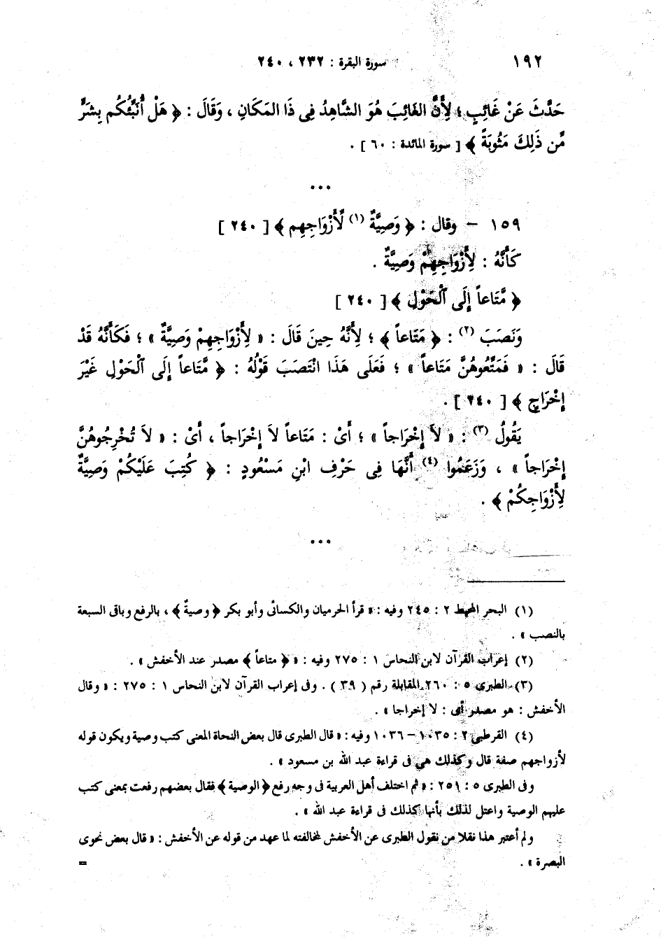 قال {وَصِيَّةً لأَزْوَاجِهِمْ} كأنه [قال] : "لأزْواجِهِمْ وَصِيَّةٌ {مَّتَاعاً إِلَى الْحَوْلِ} ونَصَبَ {مَتاعاً} لانه حين قال {لأزْواجِهِمْ} {وَصِيَّةً} فكأنه قد قال: "فَمَتِّعُوهُنَّ" {مَتاعاً} فعلى هذا انتصب قوله {مَّتَاعاً إِلَى الْحَوْلِ غَيْرَ إِخْرَاجٍ} يقول "لا إخْراجاً" أي: "متاعاً لا إخْراجاً" أي: لا تُخْرِجُوهُن إخْراجاً. وزعموا أنها في حرف ابن مسعود {كُتِبَ عَلَيكُم وَصِيَّةٌ لأزْواجِكم} .
