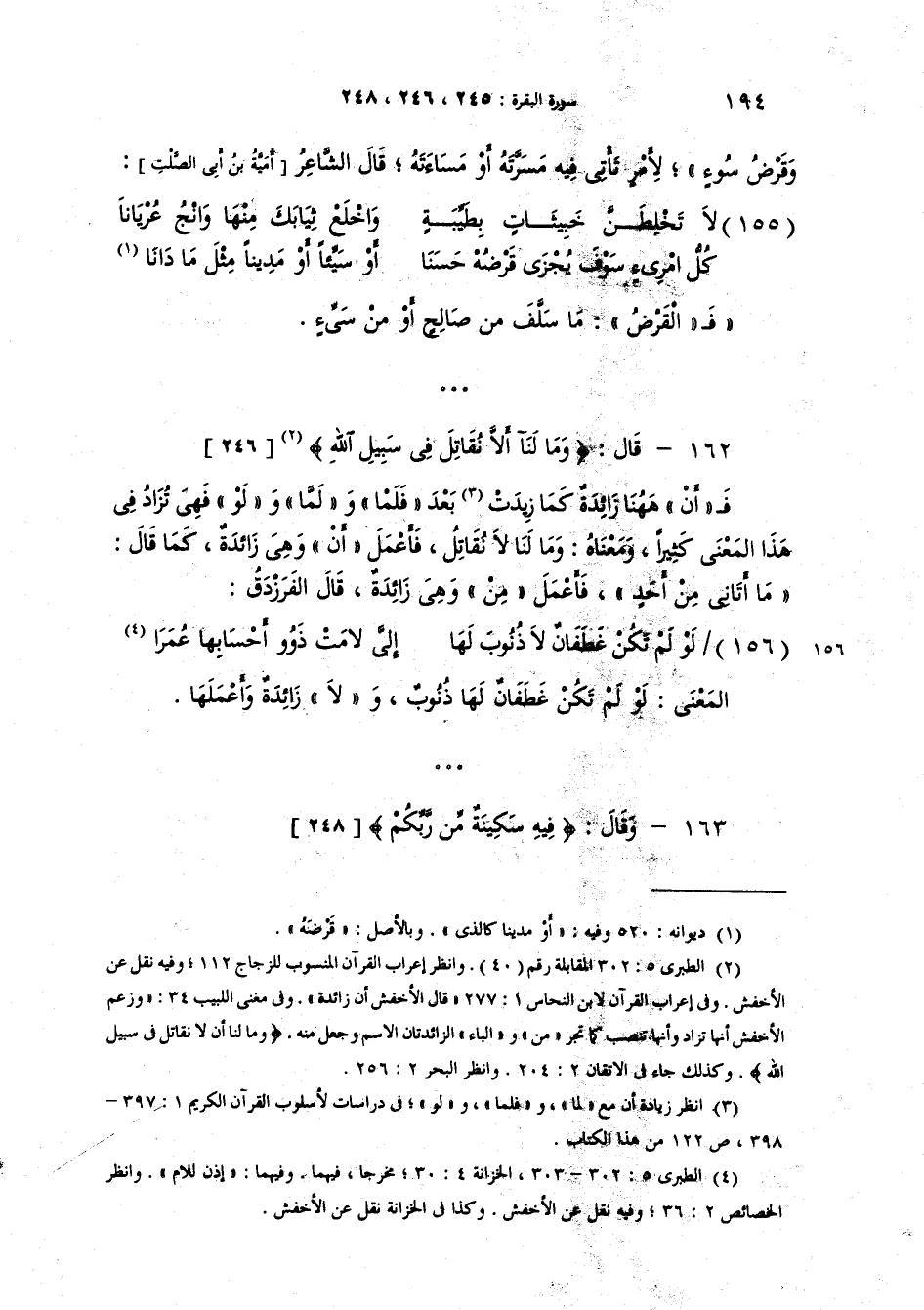 قال {وَمَا لَنَآ أَلاَّ نُقَاتِلَ فِي سَبِيلِ اللَّهِ} فـ {أنْ} ها هنا زائدة كما زيدت بعد "فلما" و"لَما" و"لَوْ" فهي تزاد في هذا المعنى كثيرا. ومعناه "وَمالنَا لا نُقَاتِلُ" فأعملَ "أَنْ" وهي زائدة كما قال: "ما أَتاني منْ أحَدٍ" فأعمل "مِنْ" وهي زائدة قال الفرزدق: [من البسيط وهو الشاهد السابع والاربعون بعد المئة] :