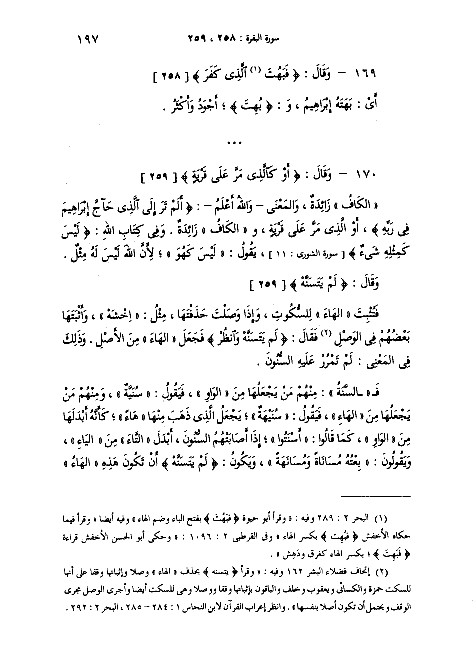 وقال {لَمْ يَتَسَنَّهْ} فتثبت الهاء للسكوت واذا وصلت حذفتها مثل {إخْشَهْ} . وأثبتها بعضهم في الوصل فقال {لَمْ يَتَسَنَّهْ وَانْظُرْ} فجعل الهاء من الاصل وذلك في المعنى: لم تمرر عليه السنون "فـ" السَّنَةُ" منهم من يجعلها من الواو فيقول: "سُنَيَّةٌ" ومنهم من يجعلها من الهاء فيقول: "سُنَيْهَةٌ" يجعل الذي ذهب منها هاء كأنه أبدلها من الواو كما قالوا: "أَسْنَتُوا": إذا أصابتهم السنون. أبدل التاء من الهاء ويقولون: "بِعْتُه مُساناةً" و"مُسانَهَةً". ويكون: {لَمْ يَتَسَنَّهْ} أن تكون هذه الهاء
