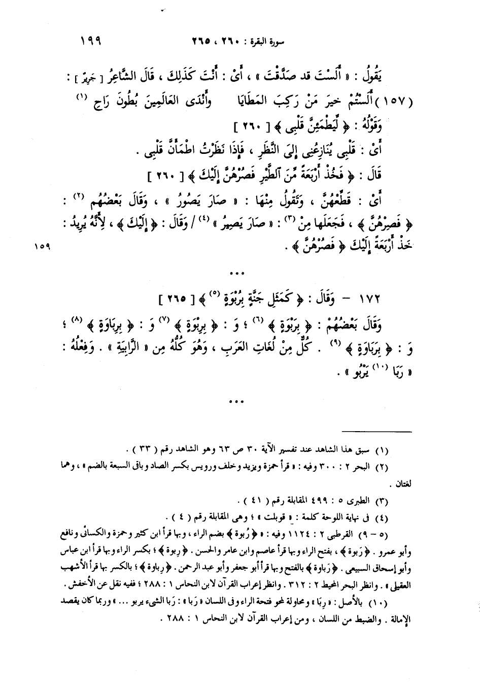 قال {فَخُذْ أَرْبَعَةً مِّنَ الطَّيْرِ فَصُرْهُنَّ إِلَيْكَ} أي: قَطِّعْهُنَّ وتقول منها: "صارَ" "يَصُورُ". وقال بعضهم {فَصُرْهُنَّ} فجعلها من "صارَ" "يَصِيرُ" [79ب] وقال {إِلَيْكَ} لانه يريد: "خُذْ أربعةً إليكَ فَصرهُنَّ".