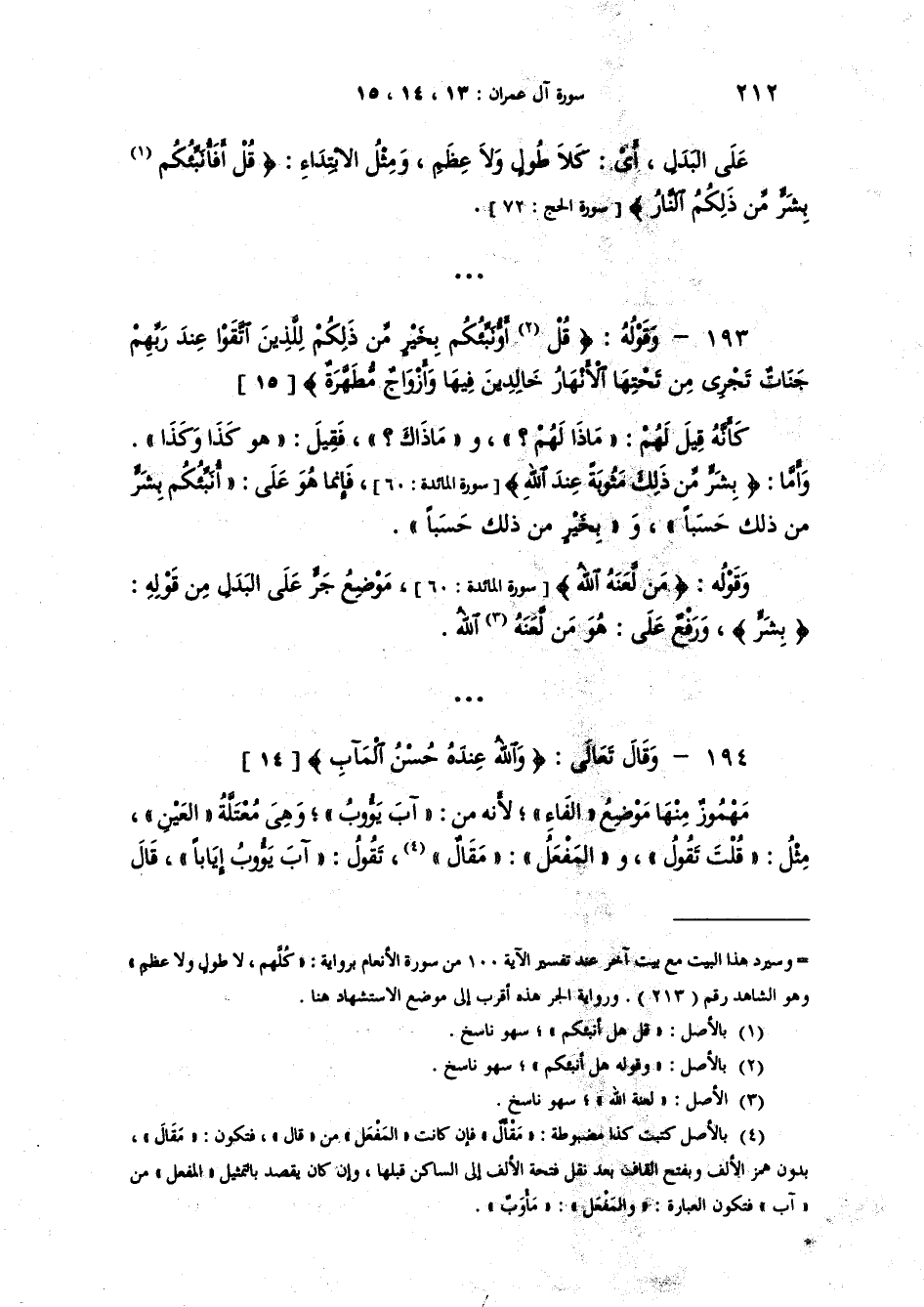 وقوله {قُلْ أَؤُنَبِّئُكُمْ بِخَيْرٍ مِّن ذالِكُمْ لِلَّذِينَ اتَّقَوْا عِندَ رَبِّهِمْ جَنَّاتٌ تَجْرِي مِن تَحْتِهَا الأَنْهَارُ خَالِدِينَ فِيهَا وَأَزْوَاجٌ مُّطَهَّرَةٌ} كأنه قيل لهم: "ماذا لهُمْ"؟ و"ماذاكَ"؟ فقيل: "هُوَ كَذا وَكَذَا". وأمَّا {بِشَرٍّ مِّن ذلك مَثُوبَةً عِندَ اللَّهِ} فانما هو على "أُنَبِّئُكُمْ بِشَرٍّ مِنْ ذَلِكَ حَسَباً" و"بِخَيْرٍ مِنْ ذلك َ حسبا". وقوله {مَن لَّعَنَهُ اللَّهُ} موضع جرّ على البدل من قوله {بِشَرٍّ} ورفع على "هُوَ مَنْ لَعَنهُ اللهُ".