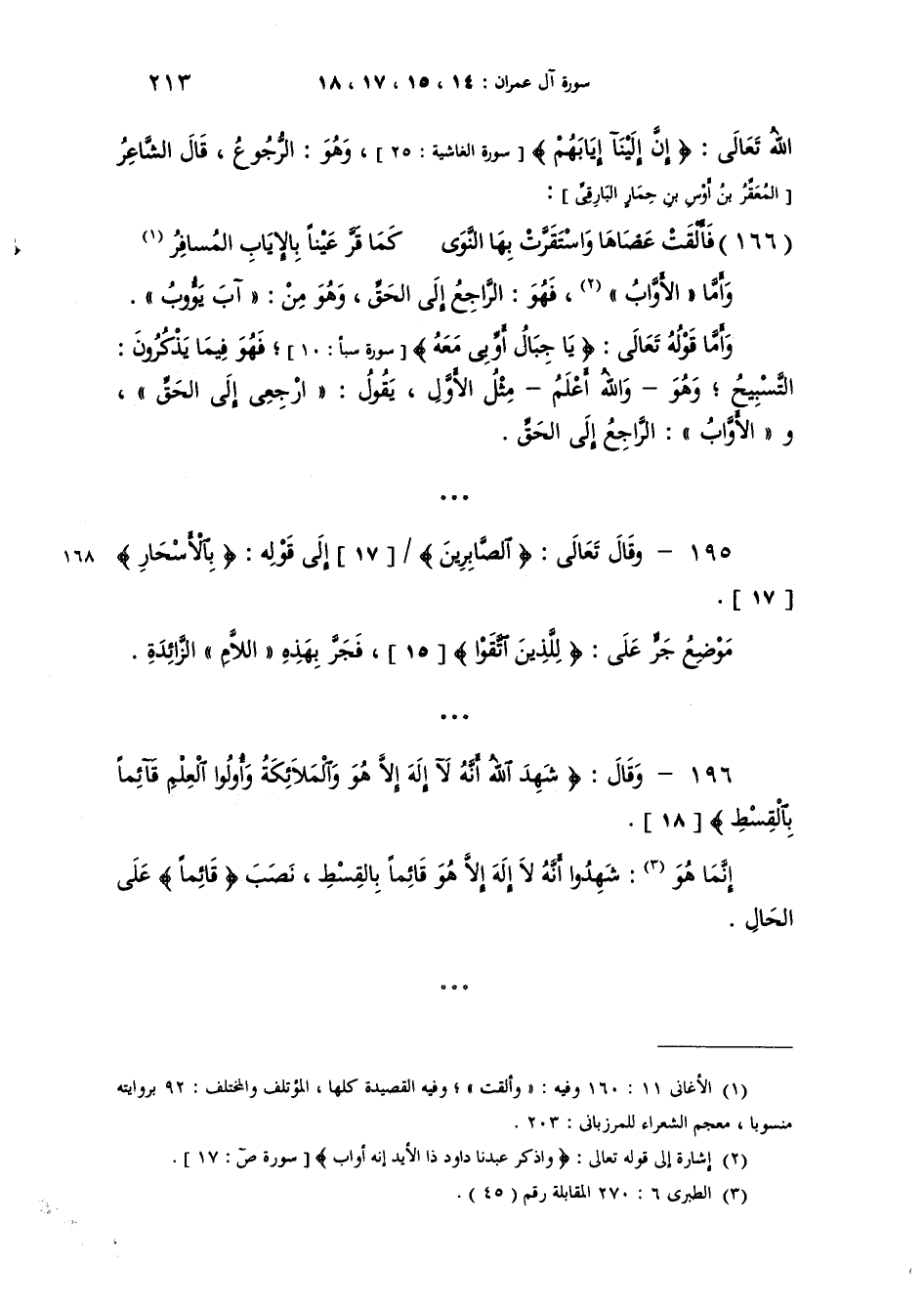 وأمَّا "الأوّابُ" فهو الراجع إلى الحق وهو من: "آبَ" "يَؤوبُ" [أيْضاً] . وأمّا قوله تعالى {ياجِبَالُ أَوِّبِي مَعَهُ} فهو كما يذكرون التسبيح أوْ هو - واللهُ أَعْلَمُ - مثلُ الأَوَّلِ يقول: "ارْجَعِي إلى الحَقِّ" و"الأوّابُ" الراجعُ إلى الحَقِّ".