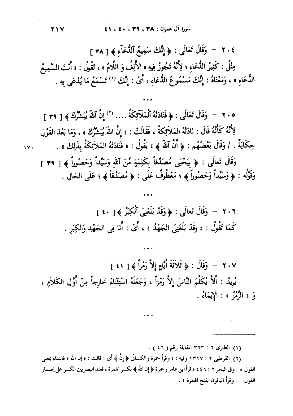 قال تعالى {فَنَادَتْهُ الْمَلائِكَةُ [وَهُوَ قَائِمٌ يُصَلِّي فِي الْمِحْرَابِ*] أَنَّ اللَّهَ يُبَشِّرُكَ} لأَنَّهُ كأنه قال {نَادَتْهُ الْمَلائِكَةُ} فقالت: {إِنَّ اللَّهَ يُبَشِّرُكَ} وما بعد القول حكاية [85ء] . وقال بعضهم {أَنَّ اللهَ} يقول: "فنادته الملائكة بذلك ".