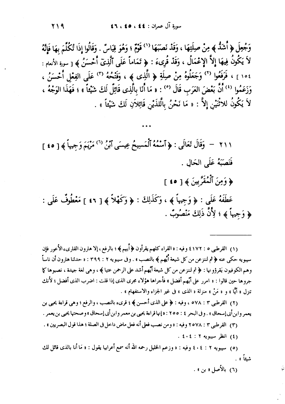وقال تعالى {اسْمُهُ الْمَسِيحُ عِيسَى ابْنُ مَرْيَمَ وَجِيهاً} نصبه على الحال {وَمِنَ الْمُقَرَّبِينَ} عطف على {وَجِيهاً} وكذلك {وَكَهْلاً} [46] معطوف على {وَجِيهاً} لأن ذلك منصوب.