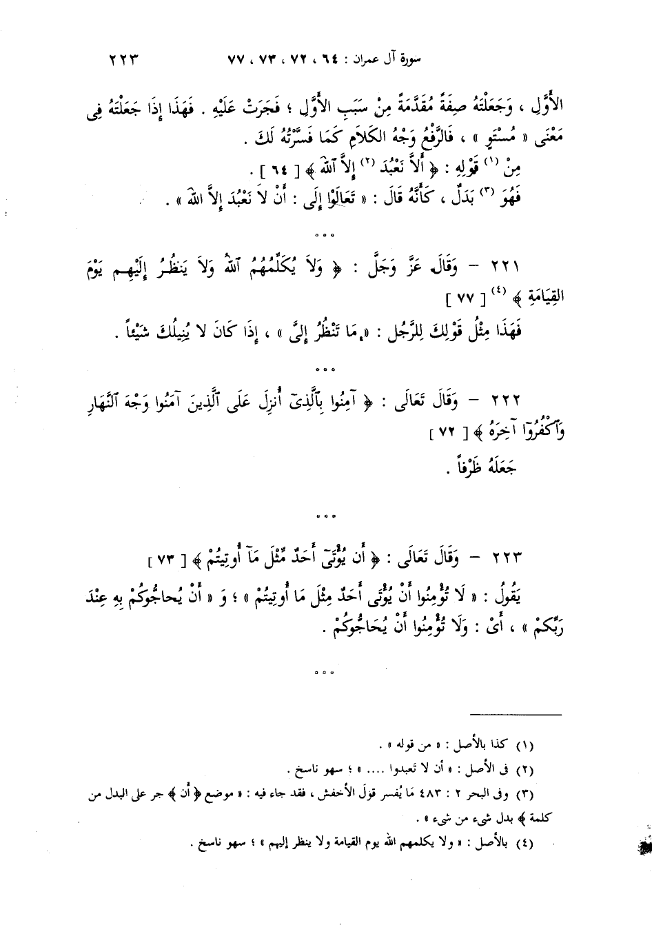 قال تعالى {أَن يُؤْتَى أَحَدٌ مِّثْلَ مَآ أُوتِيتُمْ} يقول "لا تُؤْمِنُوا أَنْ يُؤْتى أَحَدٌ مِثْلَ ما أُوتِيتُم وأَنْ يُحَاجُّوكُمْ بِهِ عِنْدَ رَبِّكُمْ" أي: وَلا تُؤْمِنُوا أَنْ يُحَاجُّوكُمْ.