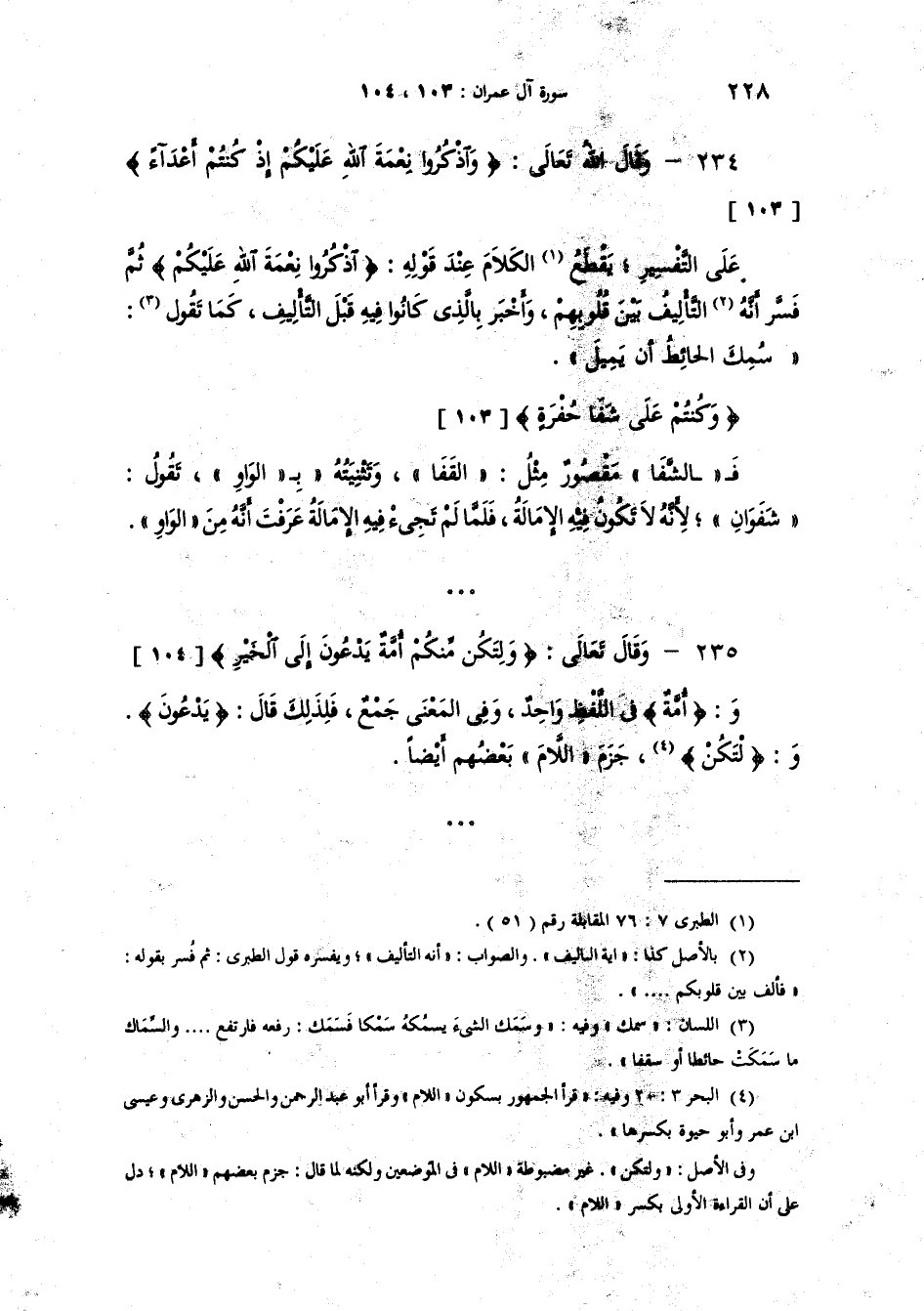 قال الله تعالى {وَاذْكُرُواْ نِعْمَتَ اللَّهِ عَلَيْكُمْ إِذْ كُنْتُمْ أَعْدَآءً} على التفسير بقطع الكلام عند قوله {اذْكُرُواْ نِعْمَتَ اللَّهِ عَلَيْكُمْ} ثم فسر آية التأليف بين قلوبهم وأخبر بالذي كانوا فيه قبل التأليف كما تقول "أسمك الحائِطَ أَنْ يَميل".