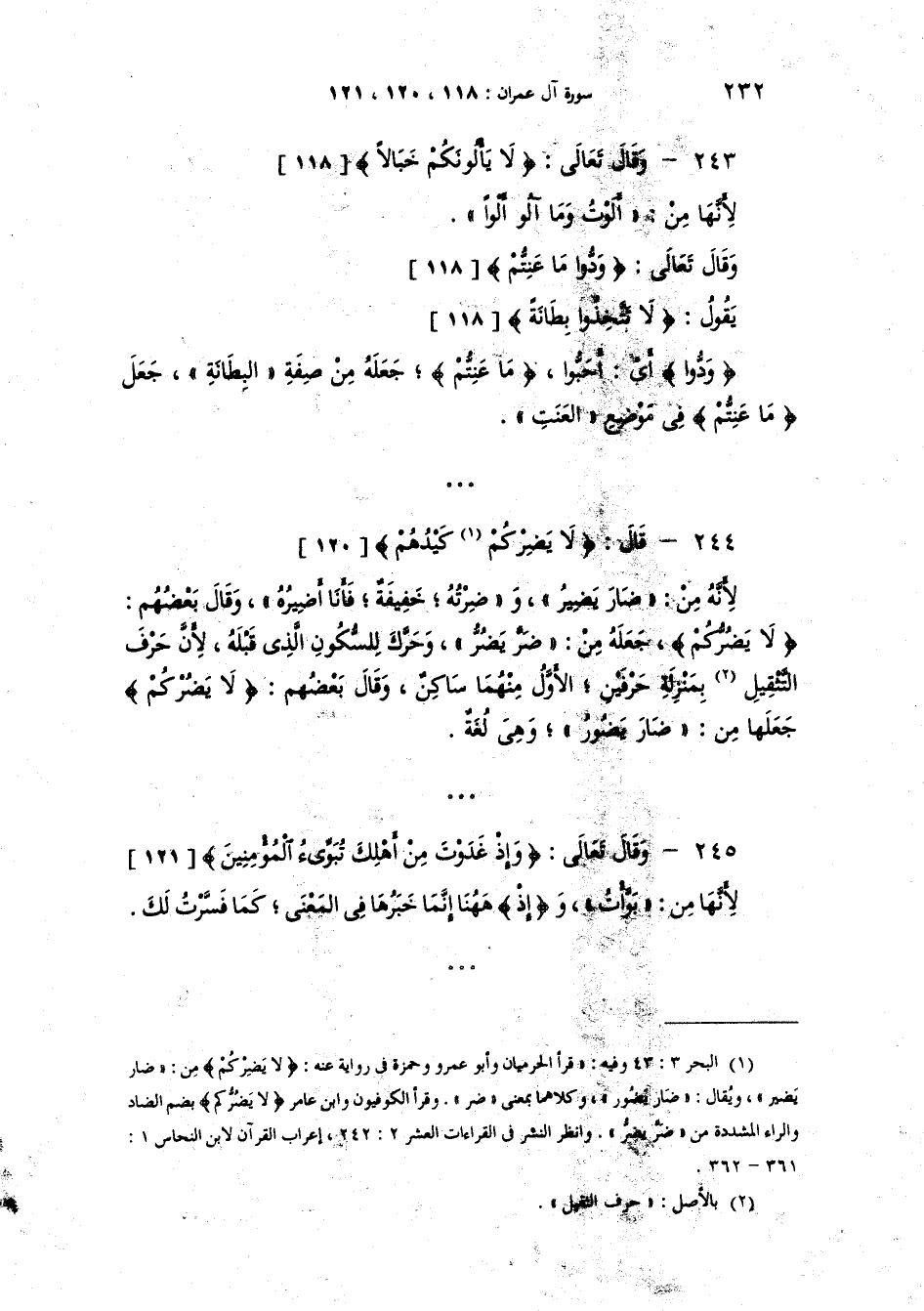 قال {لاَ يَضِرْكُمْ كَيْدُهُمْ} لأنه من "ضار" "يَضِير" و"ضِرْتُه" خفيفة "فَأَنَا أَضِيرُه"، قال بعضهم {لا يضُرُّكُمْ} جعله من "ضَرَّ" "يَضُرُّ" وحرّك للسكون الذي قبله لأن الحرف الثقيل بمنزلة حرفين الأول منهما ساكن. وقال بعضهم {لا يَضُرْكم} جعلها من "ضار" "يضُور" وهي لغة.
