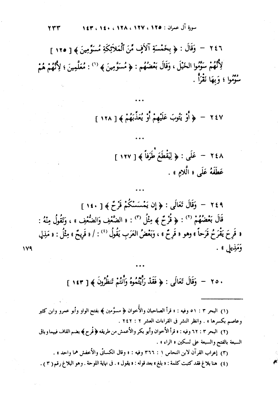 قال {بِخَمْسَةِ آلافٍ مِّنَ الْمَلائِكَةِ مُسِوِّمِينَ} لأنهم سَوَّمُوا الخيل. وقال بعضُهم {مُسَوَّمينَ} مُعَلِمينَ لأَنَّهُمْ هْم سُوِّمُوا وبها نقرأ.