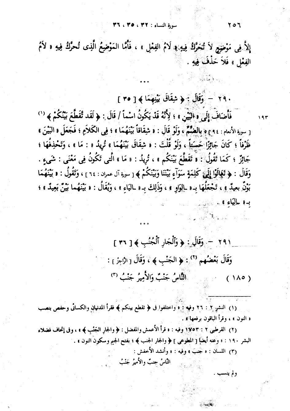 قال {شِقَاقَ بَيْنِهِمَا} فأضاف الى البين لأنه قد يكون اسما [96ب] قال {لَقَد تَّقَطَّعَ بَيْنُكُمْ} بالضم. ولو قال {شِقَاقاً بَيْنَهما} في الكلام فجعل البَيْن ظرفا كان جائزا حسنا. ولو قلت {شِقاقَ بينَهما} تريد {ما} وتحذفها جاز، كما تقول {تَّقَطَّعَ بَيْنَكُمْ} تريد {ما} التي تكون في معنى شيء. وقال {تَعَالَوْاْ إِلَى كَلِمَةٍ سَوَآءٍ بَيْنَنَا وَبَيْنَكُمْ} . وتقول "بينَهُما بَوْنٌ بَعِيدٌ" تجعلها بالواو وذلك بالياء. ويقال: "بينَهما بَيْنٌ بَعيدٌ" بالياء.