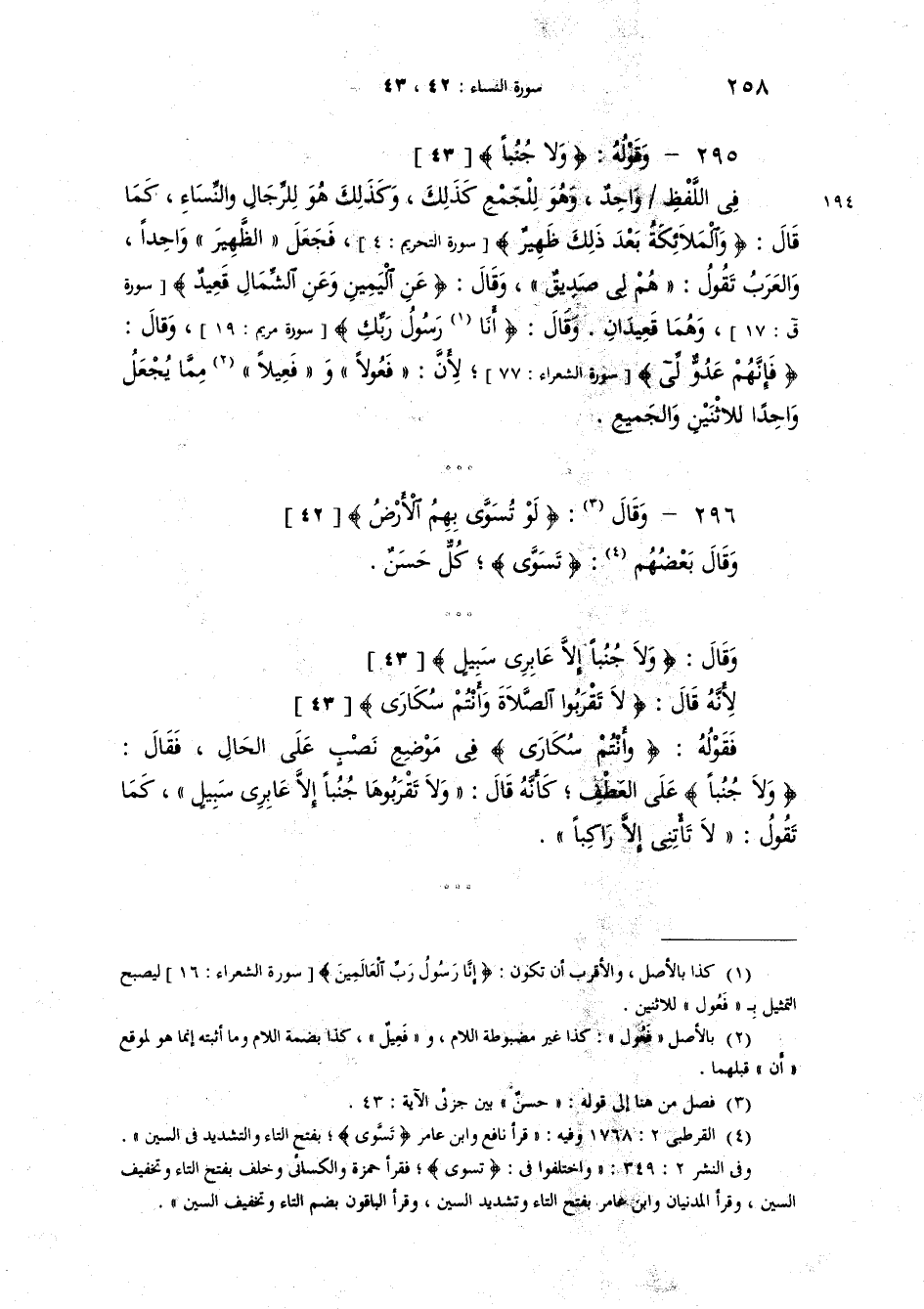 وقال {وَلاَ جُنُباً إِلاَّ عَابِرِي سَبِيلٍ} لأنه قال {لاَ تَقْرَبُواْ الصَّلاَةَ وَأَنْتُمْ سُكَارَى} فقوله {وأَنْتُمْ سُكَارَى} في موضع نصب على الحال، فقال {وَلاَ جُنُباً} على العطف كأنه قال: "وَلا تَقْرَبُوها جُنْباً إِلاّ عابِري سَبِيلٍ" كما تقول: "لا تَأْتِي إِلاّ رَاكِباً".